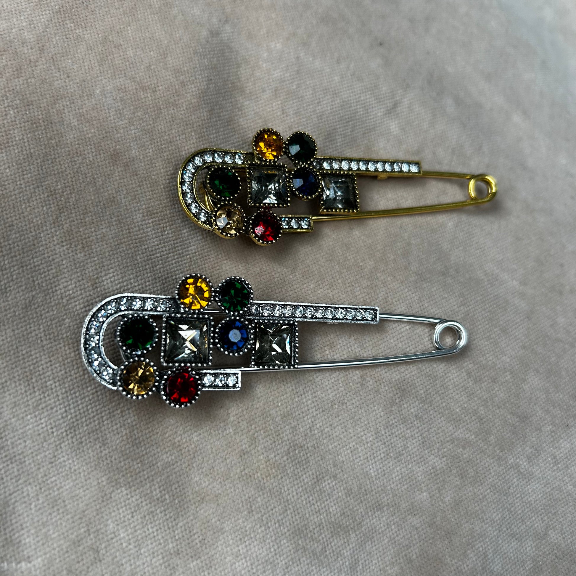 These Art Deco Styled Jewelled Brooches are fabulous. Safety pin shaped in gold or silver plating, with cubic zirconia and jewel coloured bright gems, they look great on the lapel of a winter coat, blazer or your favourite knit.