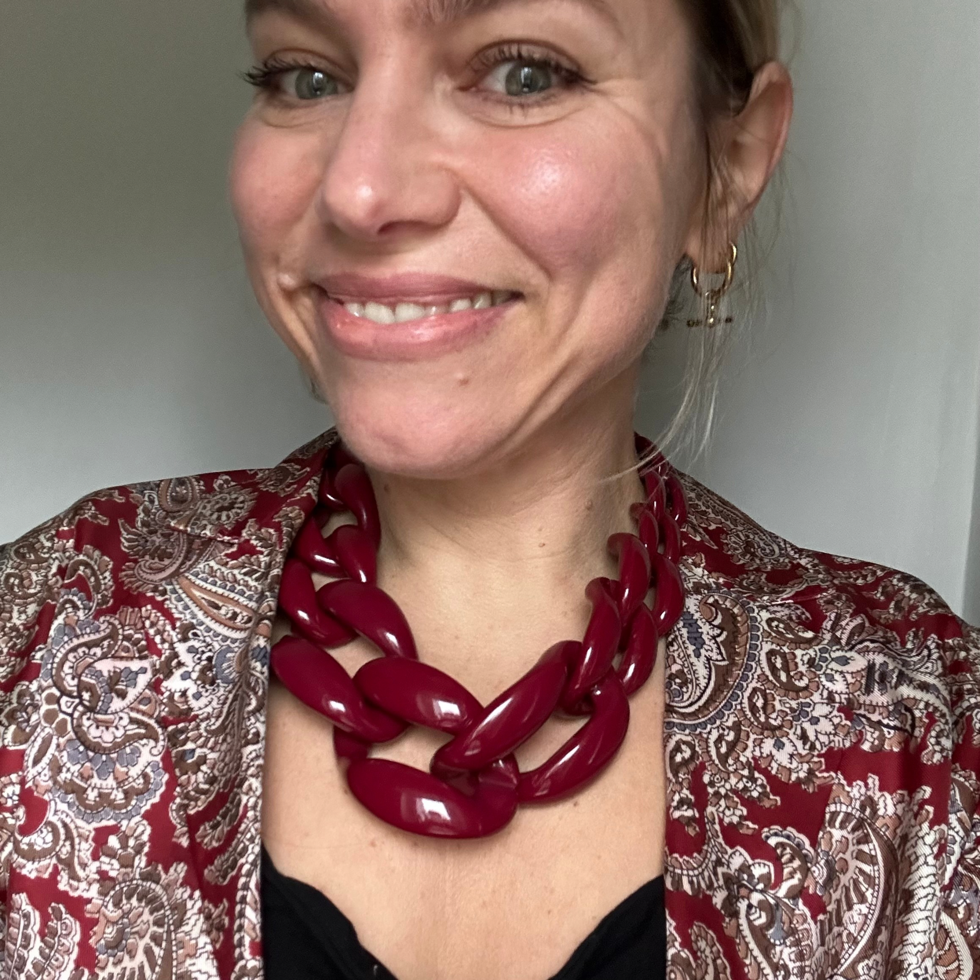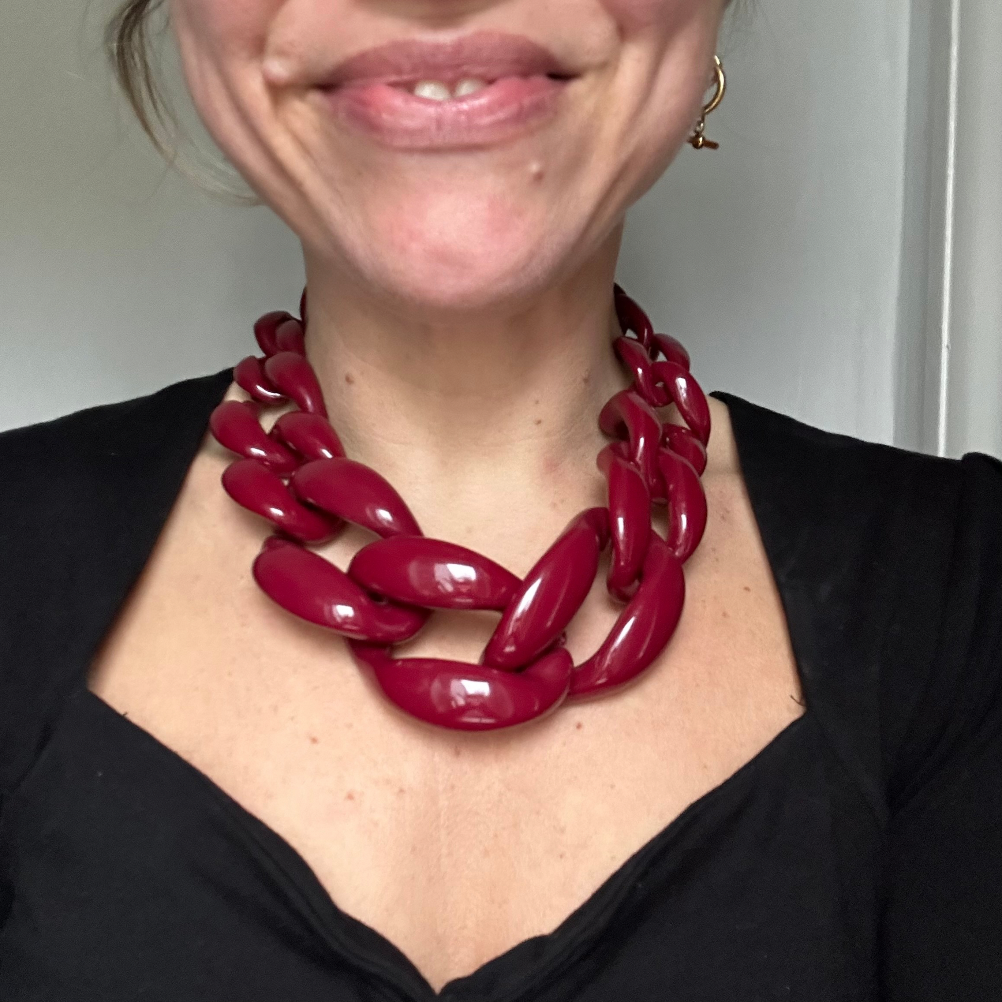 These Chunky Link Statement Necklaces are a great way to update your outfit. In burgundy gloss.