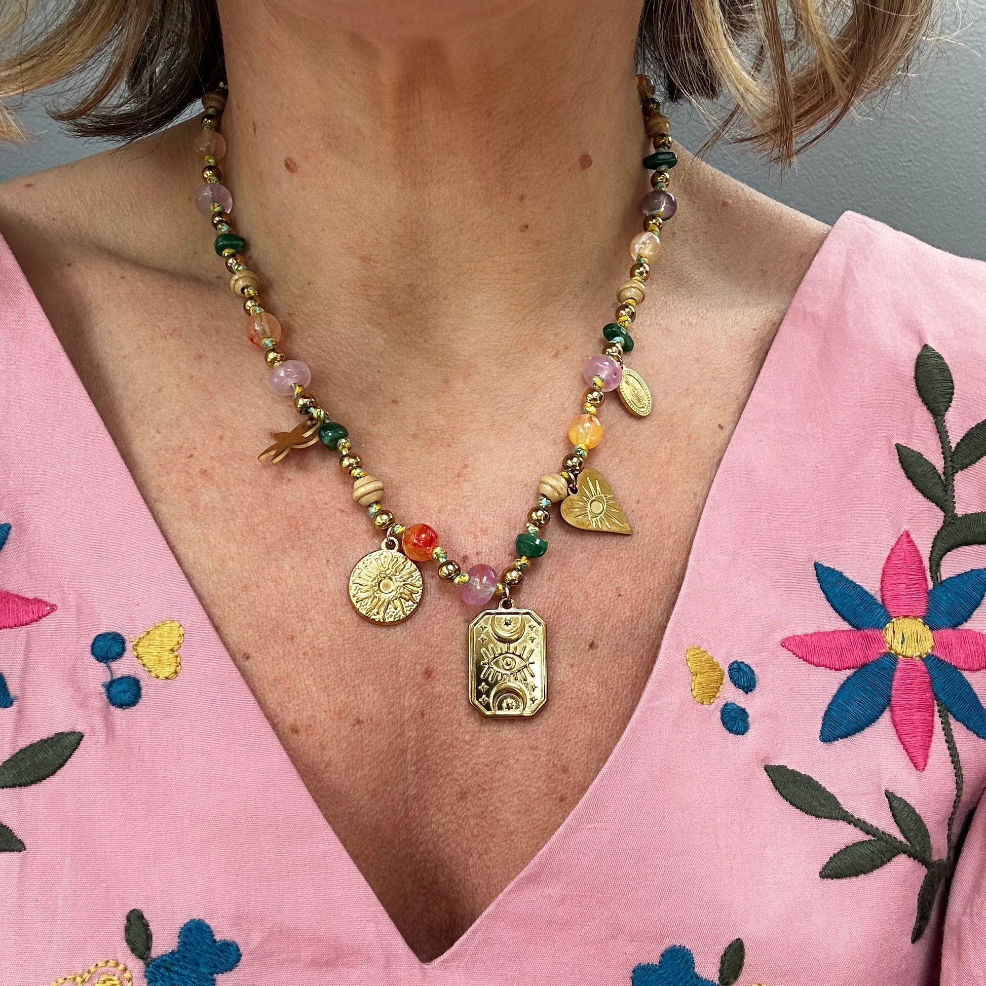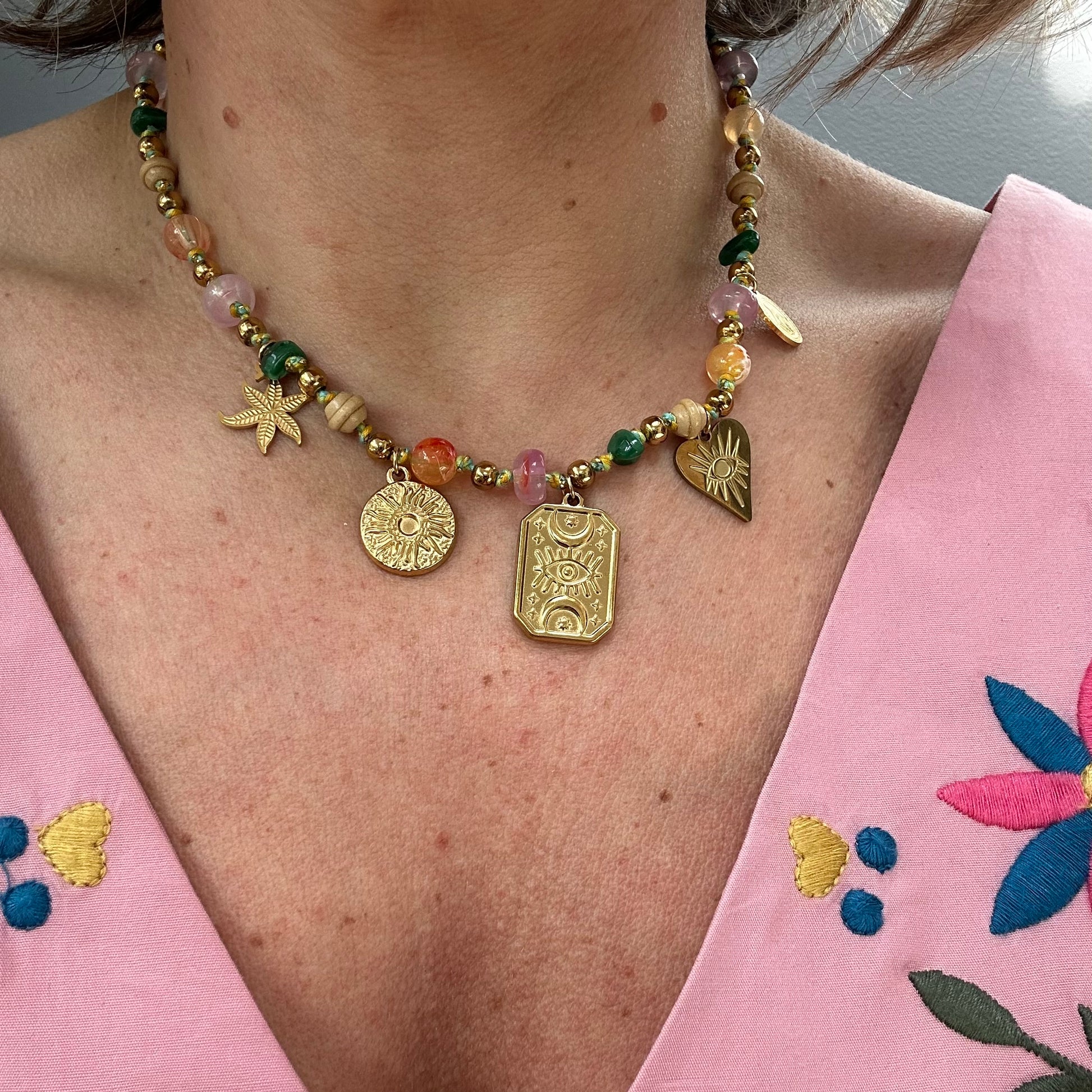 This necklace features stainless steel charms (sun, heart eye, starfish) and brightly coloured Natural Stone beads for a boho holiday feel. It looks great worn with an open neckline whether it’s your fave Summer dress or your new crochet co-ord. Why not wear it with a white shirt to work to bring little sunshine into your work wardrobe! Compliments guaranteed!