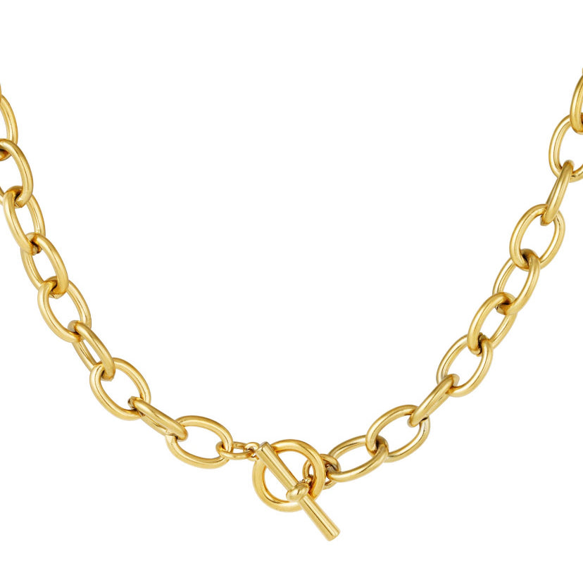 A gorgeous chunky gold necklace featuring a T bar fastening, this necklace is 18-carat Gold Plating on Stainless Steel, which makes it waterproof and means you need never take it off. Wear alone or layer up.