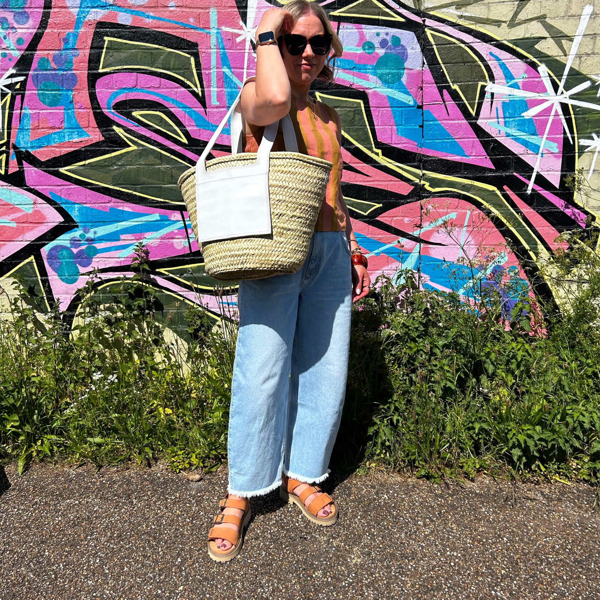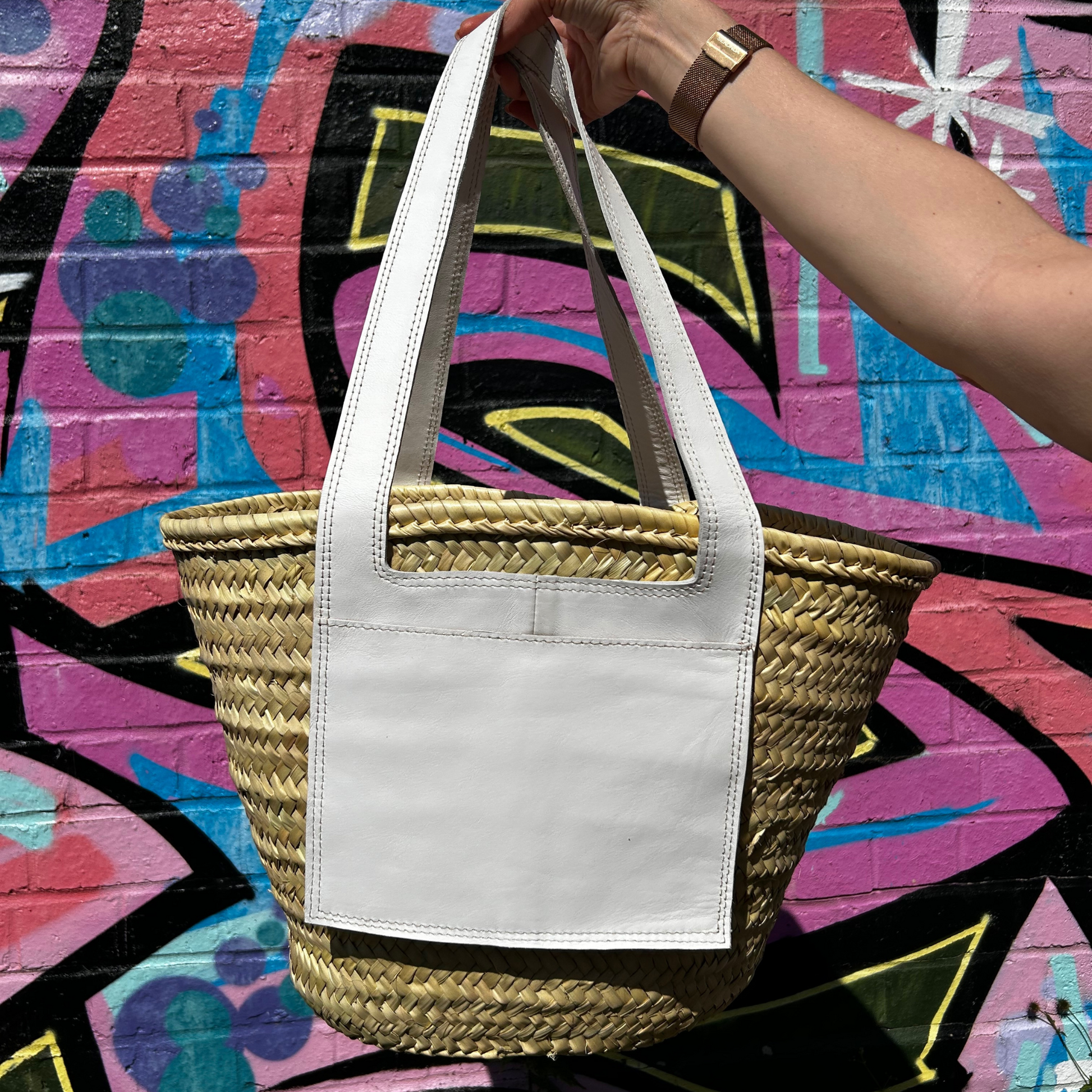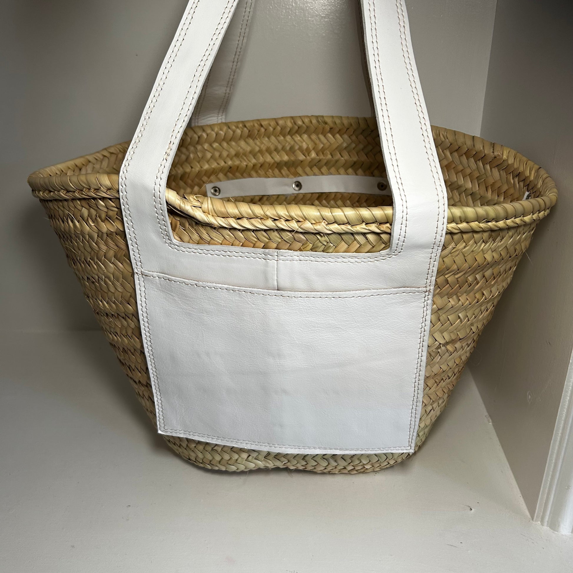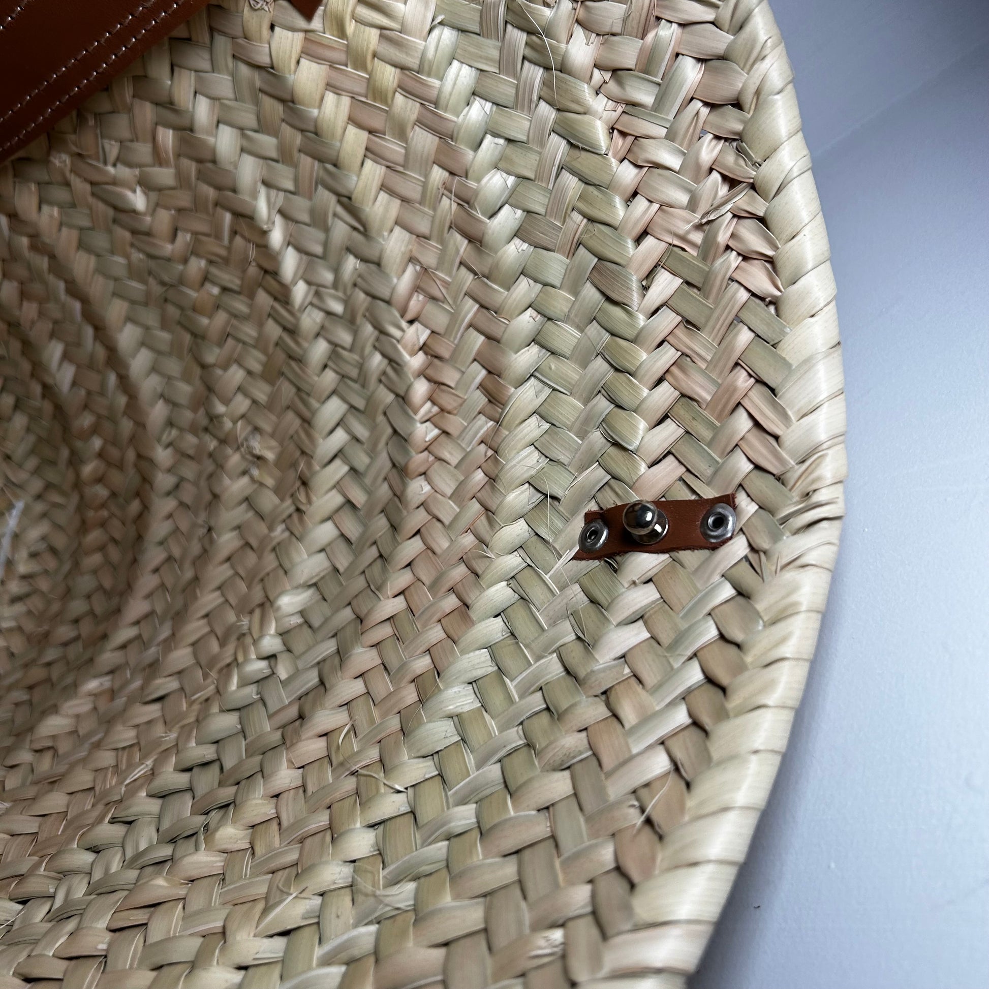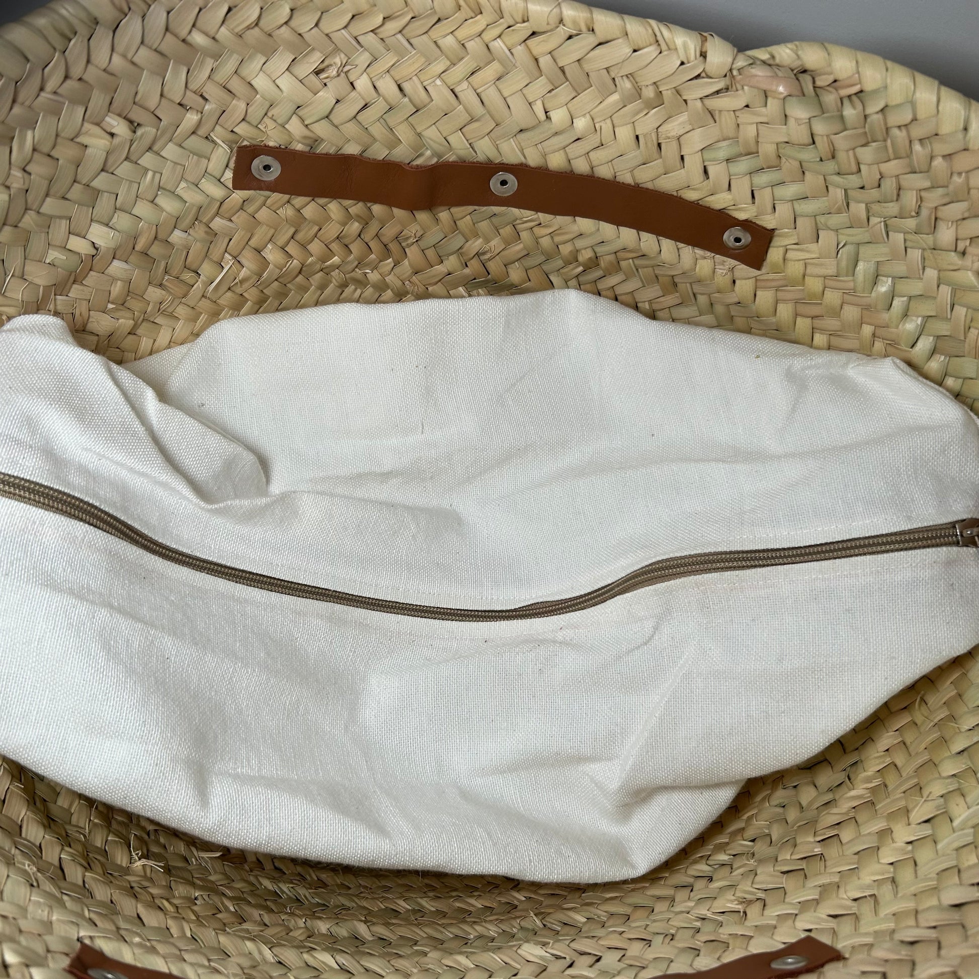 These luxe Large Straw and Leather Basket bags are handmade in Morocco, the perfect summer holiday beach bag, market bag, yoga bag, shopping bag, work bag and are beautiful. They have an outer leather patch pocket and an inner cotton detachable zipped pouch for your valuables. This attaches to the basket via two studs