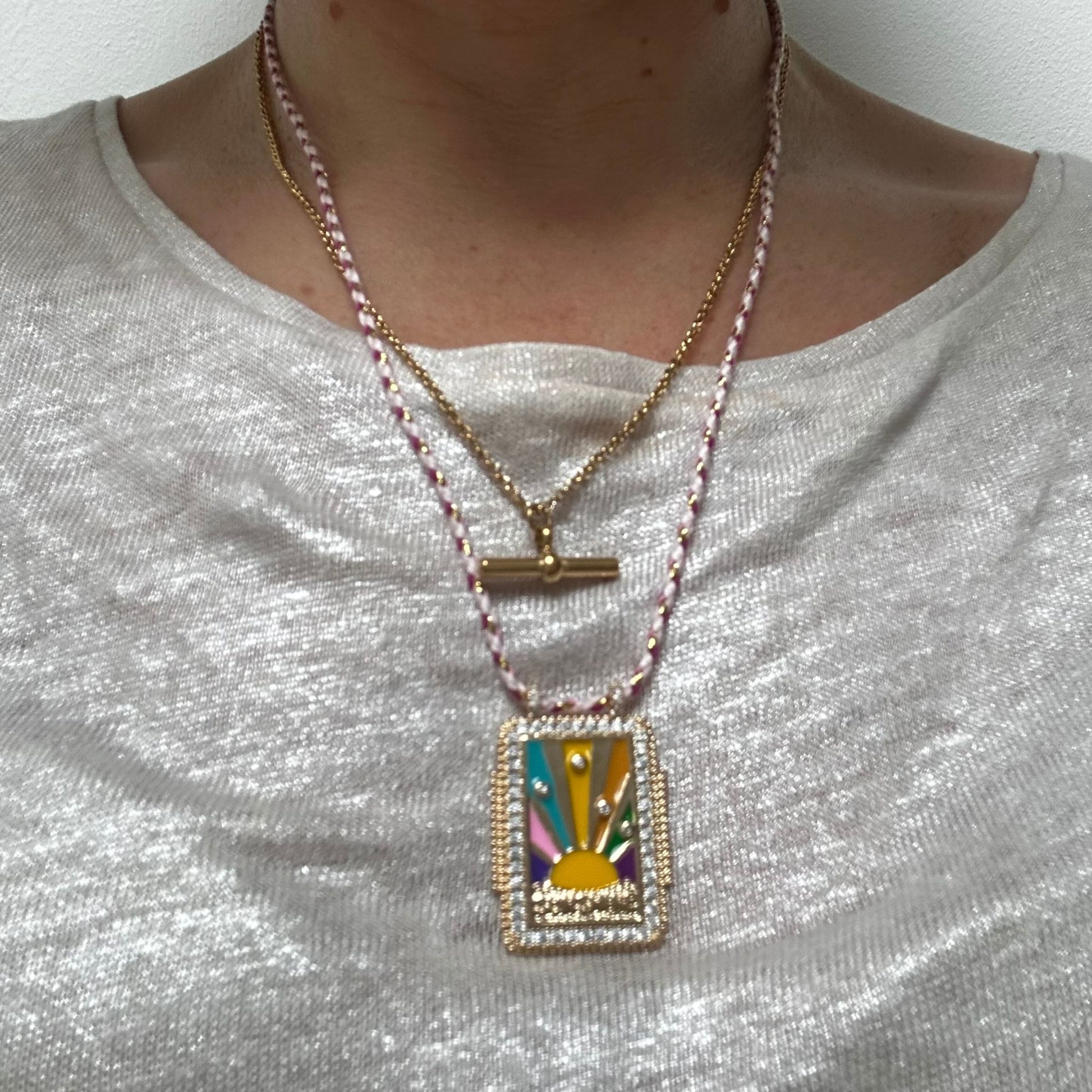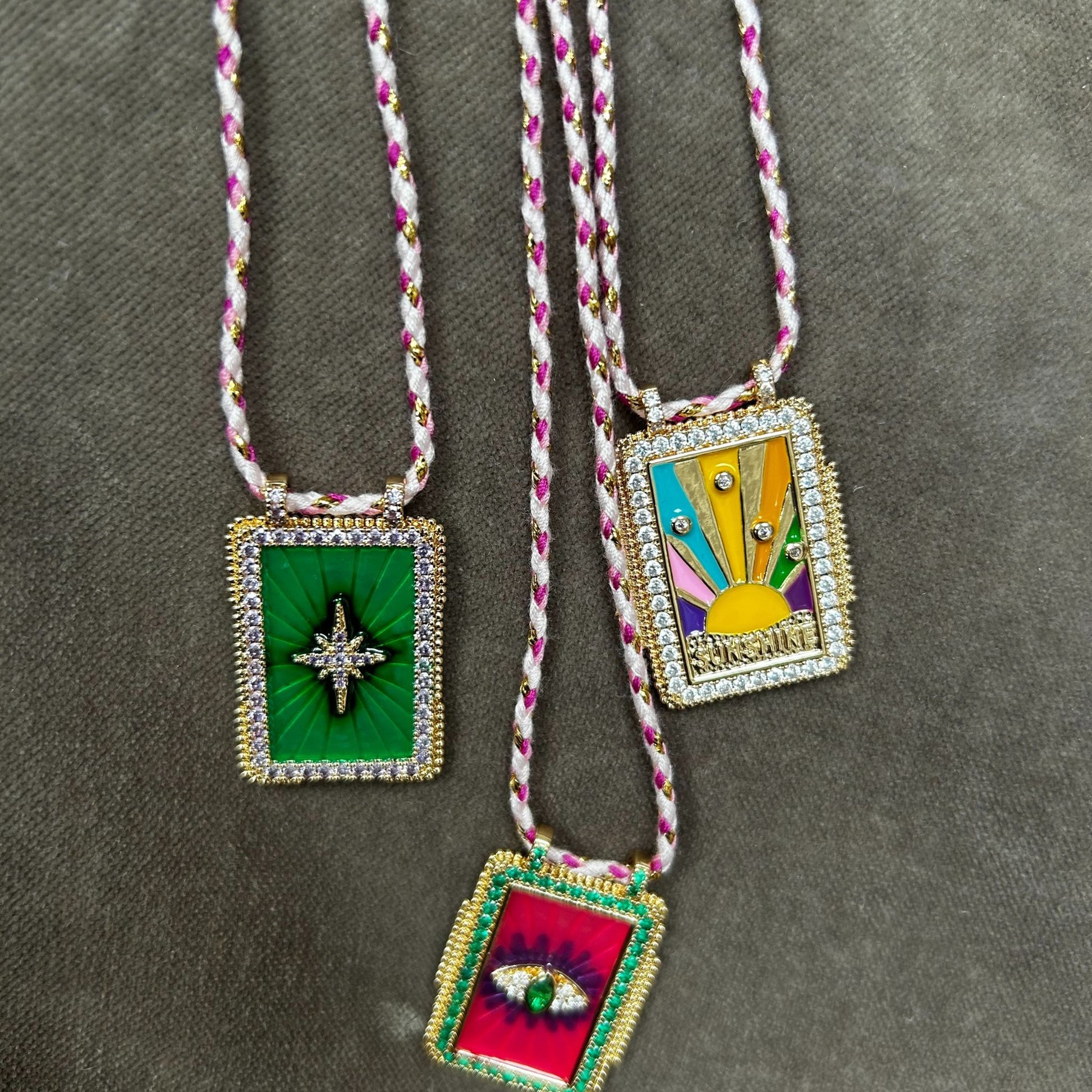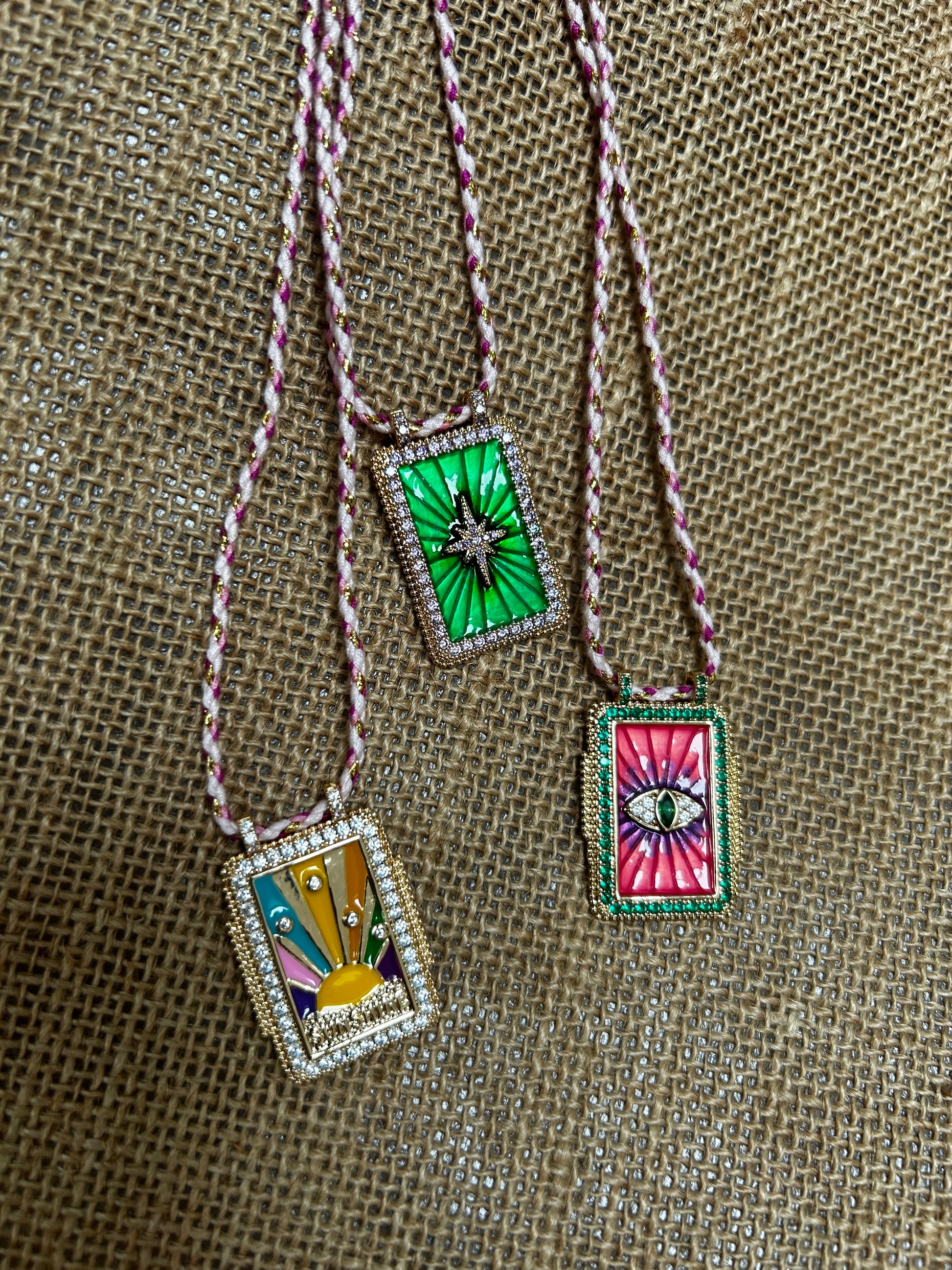 These Tag necklaces are a super cute addition to your summer layers. Featuring bright coloured enamel and stones on a pink woven necklace, these are adjustable and can be worn at different lengths.