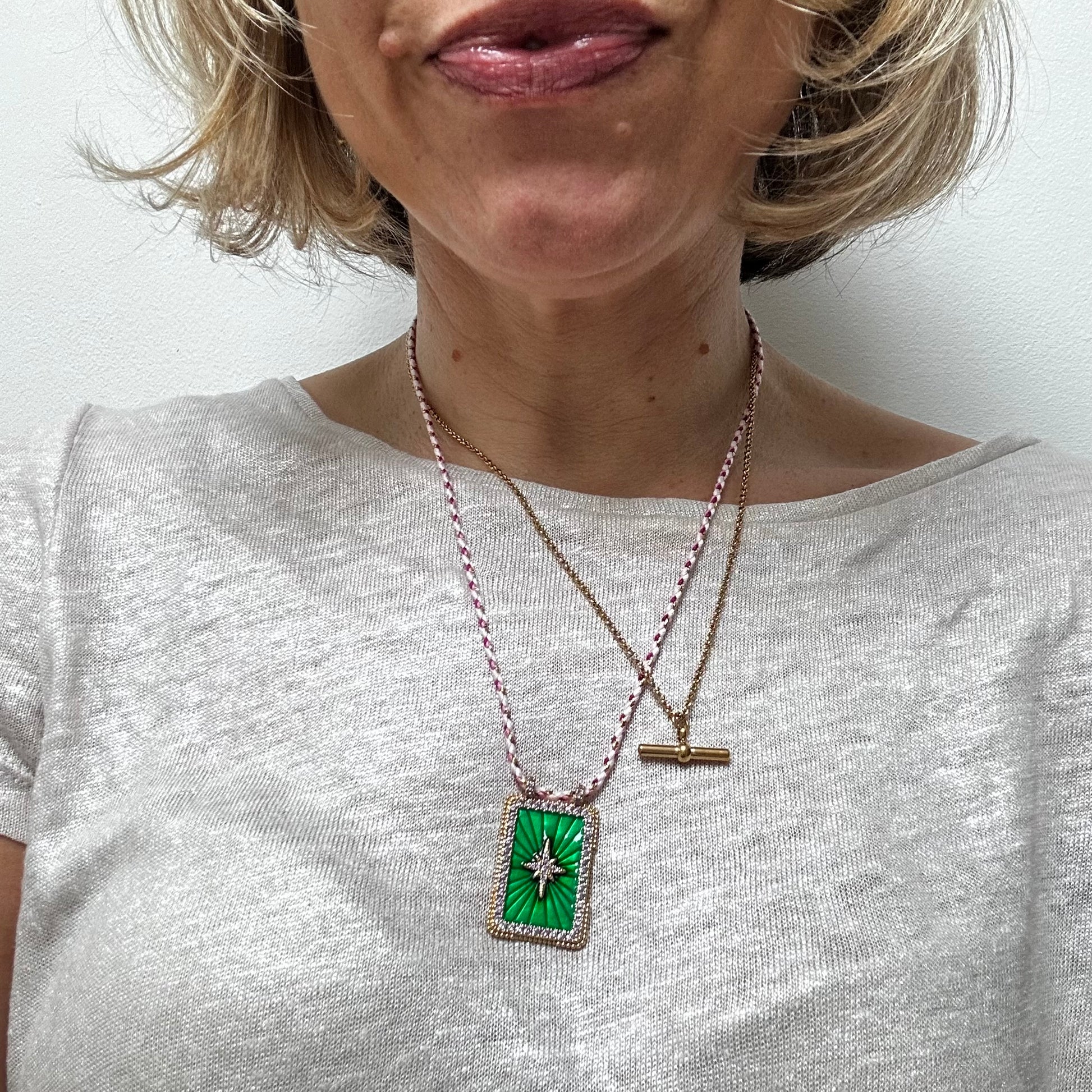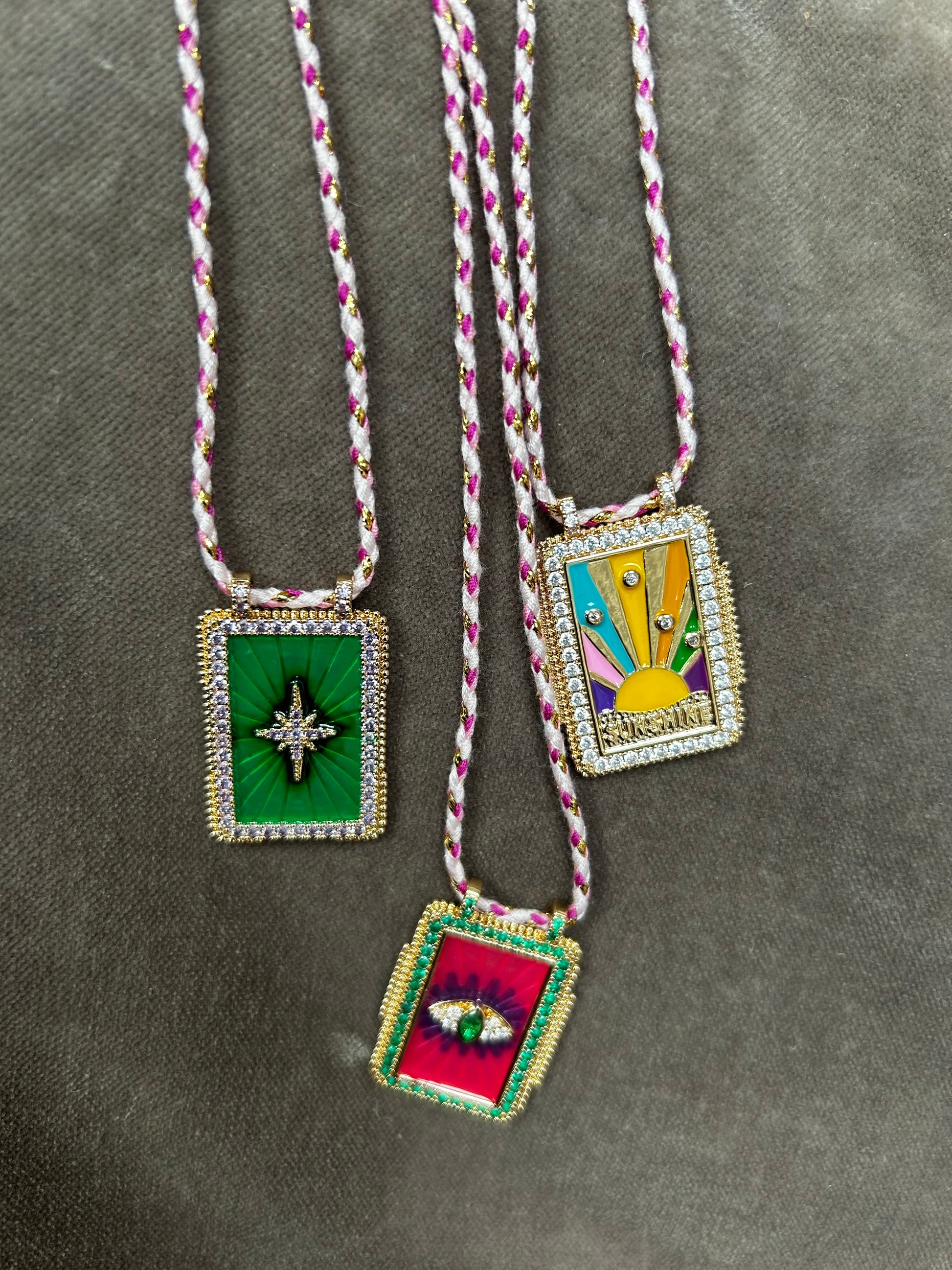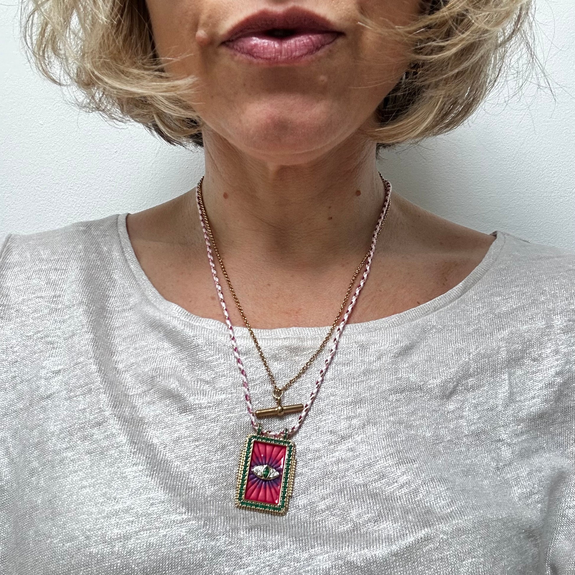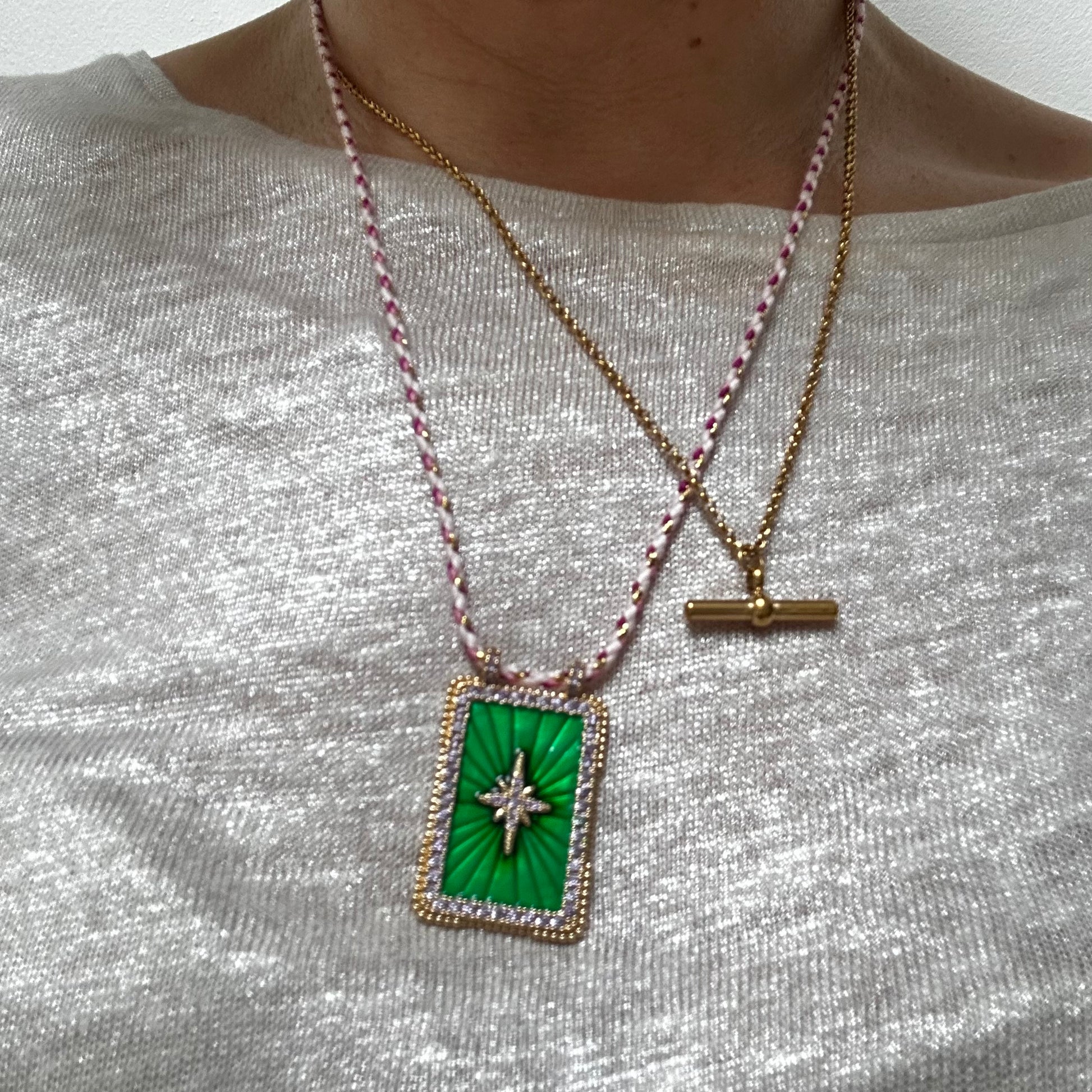 These Tag necklaces are a super cute addition to your summer layers. Featuring bright coloured enamel and stones on a pink woven necklace, these are adjustable and can be worn at different lengths.