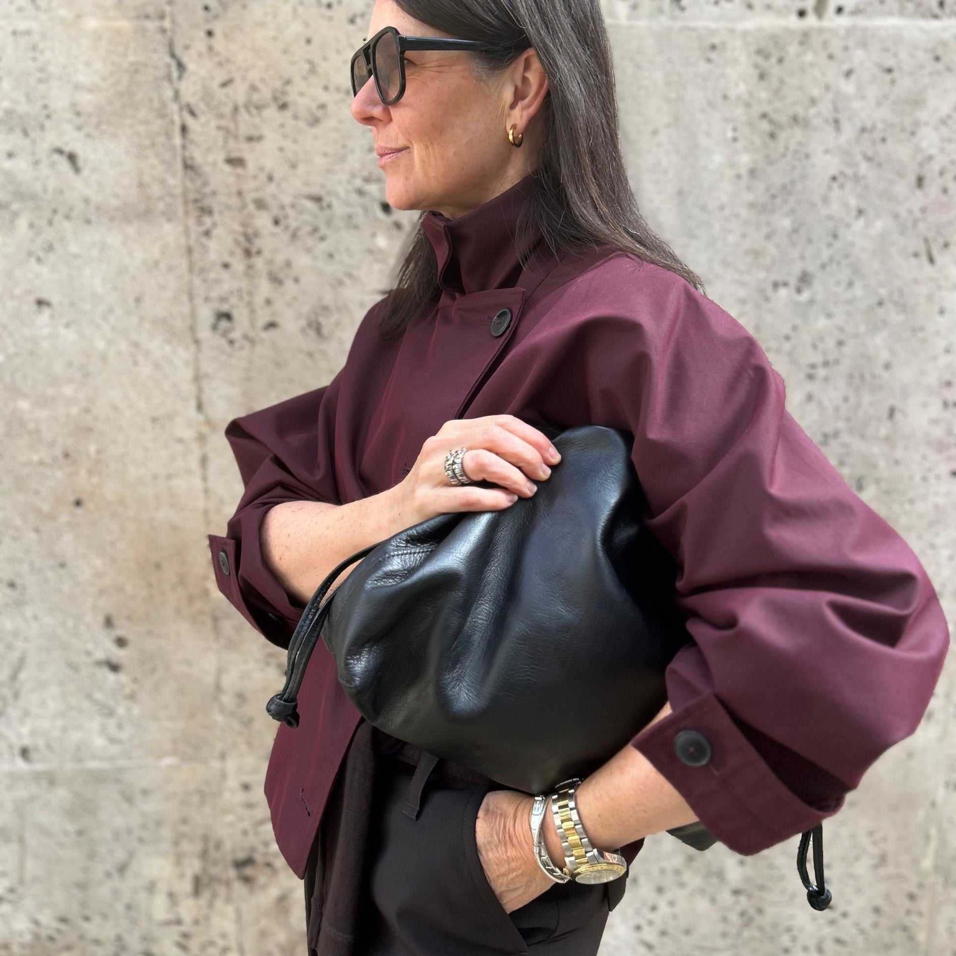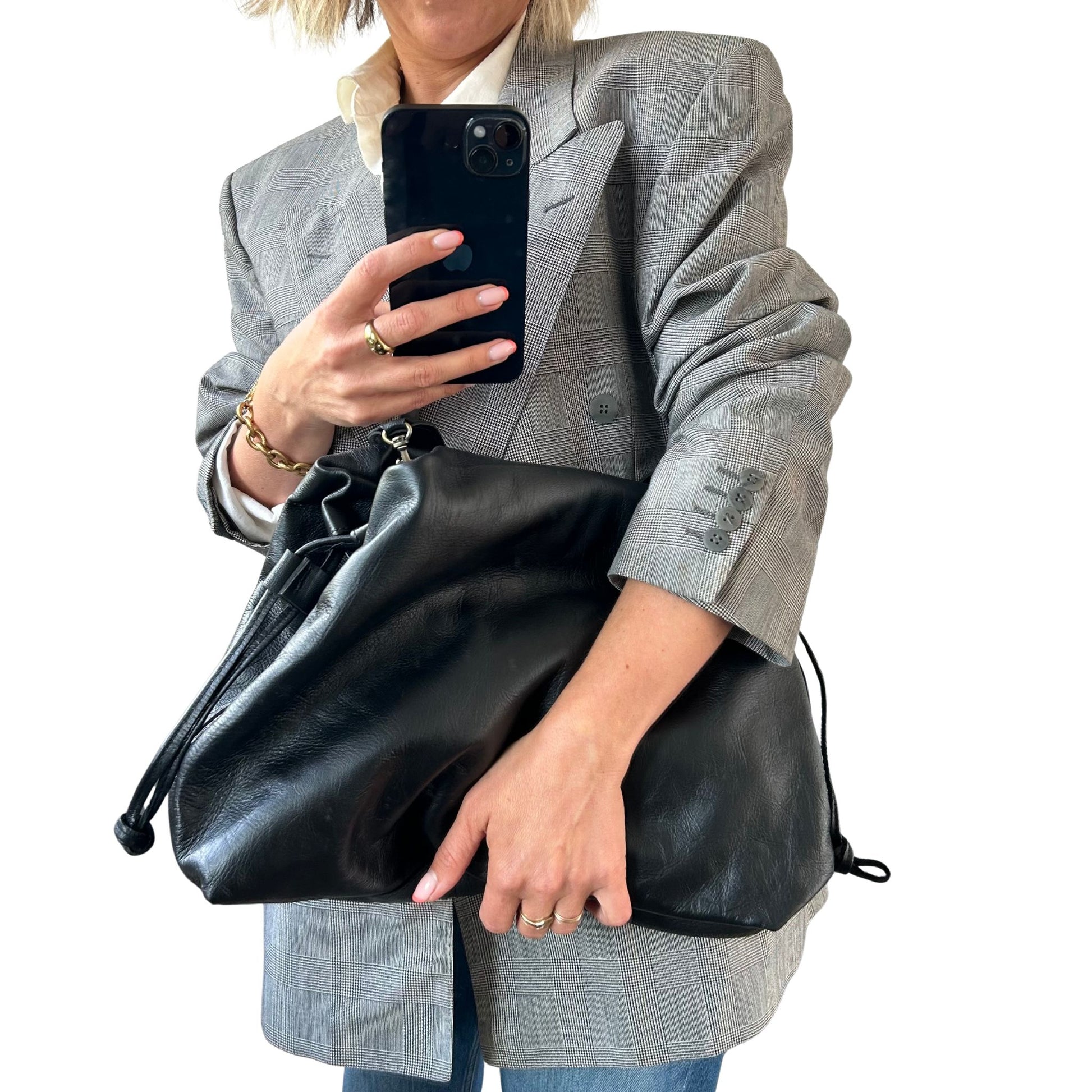 I absolutely love this large drawstring Leather Slouch tote Bag. This vintage-inspired slouchy leather shoulder / clutch bag in black or dark brown is just perfect and will take you from day to night.