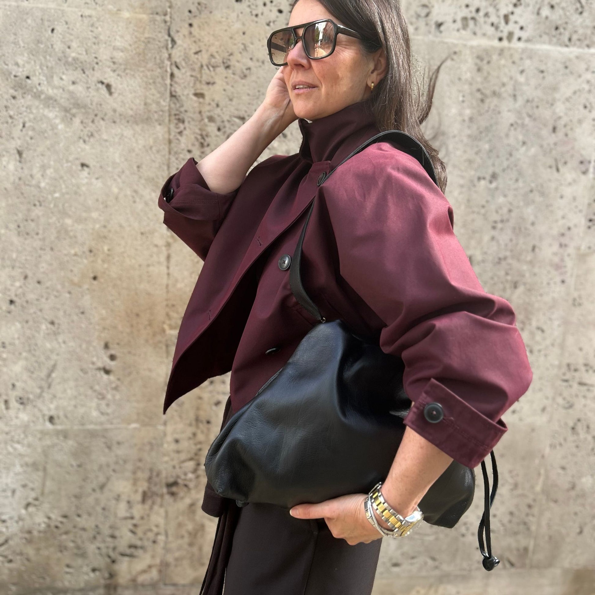 IT’s spacious enough for your daily essentials. The soft leather structure closes by a magnet and drawstring style closure. This versatile piece comes with a removable shoulder strap, giving you the option to wear it as a relaxed shoulder bag or carry it as a stylish leather clutch.