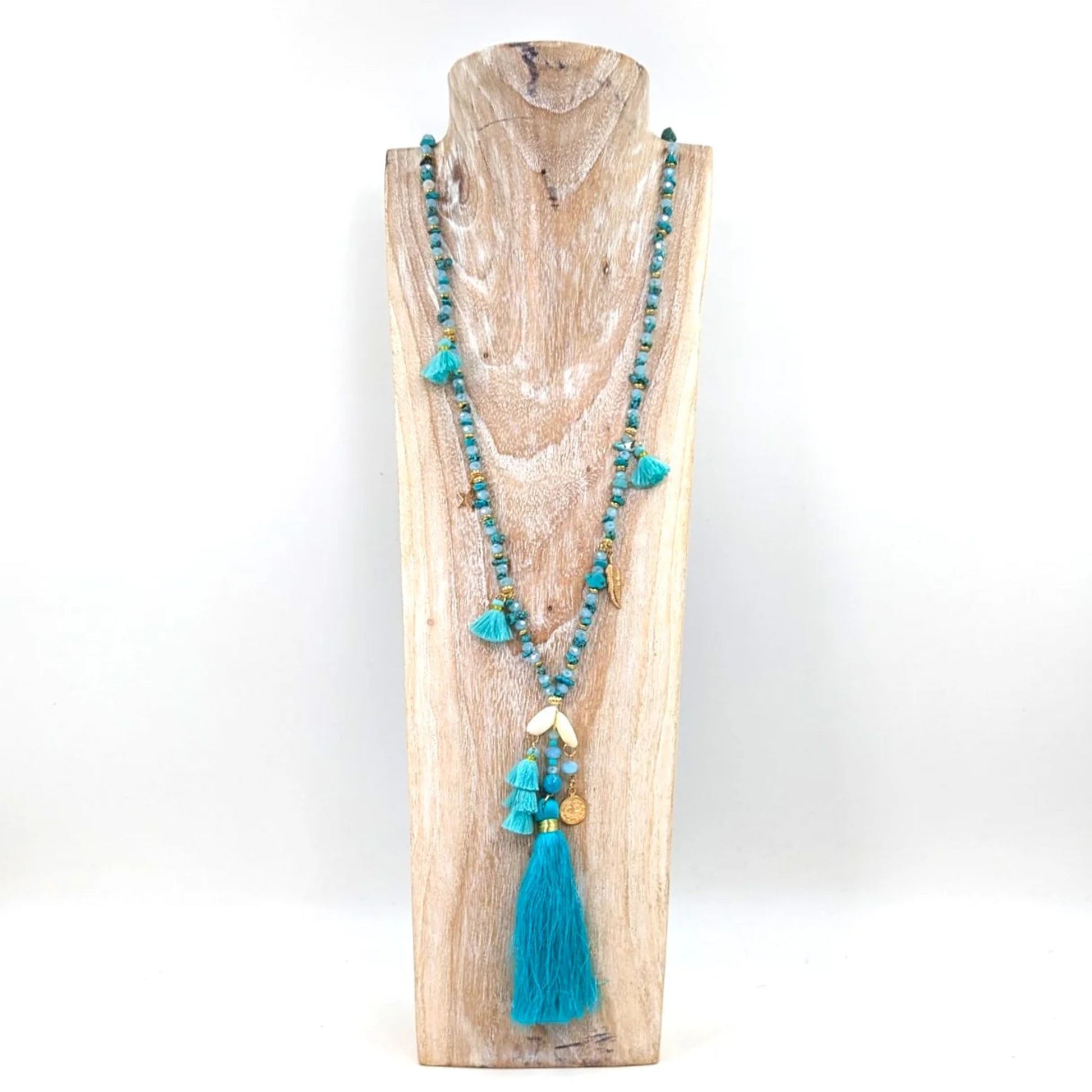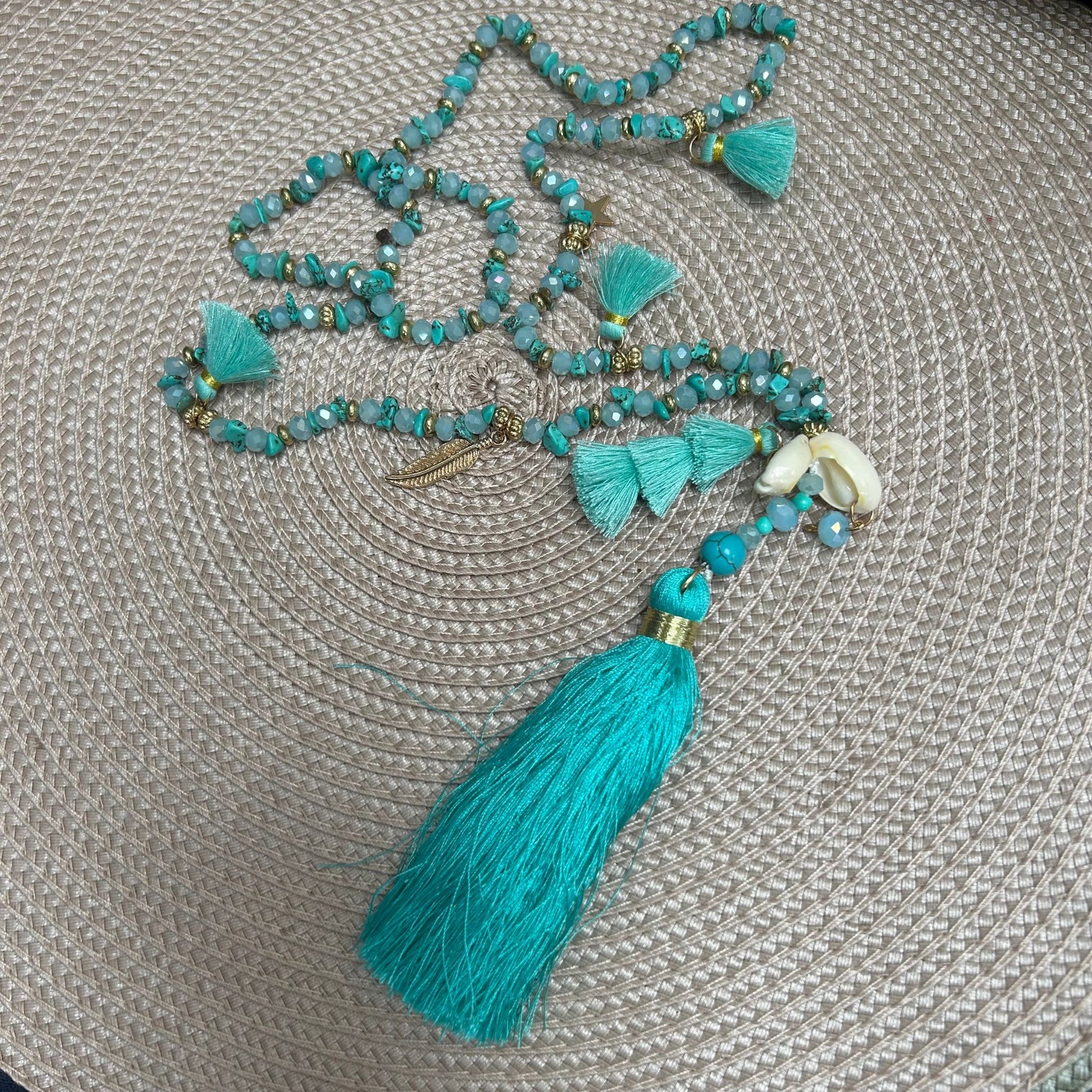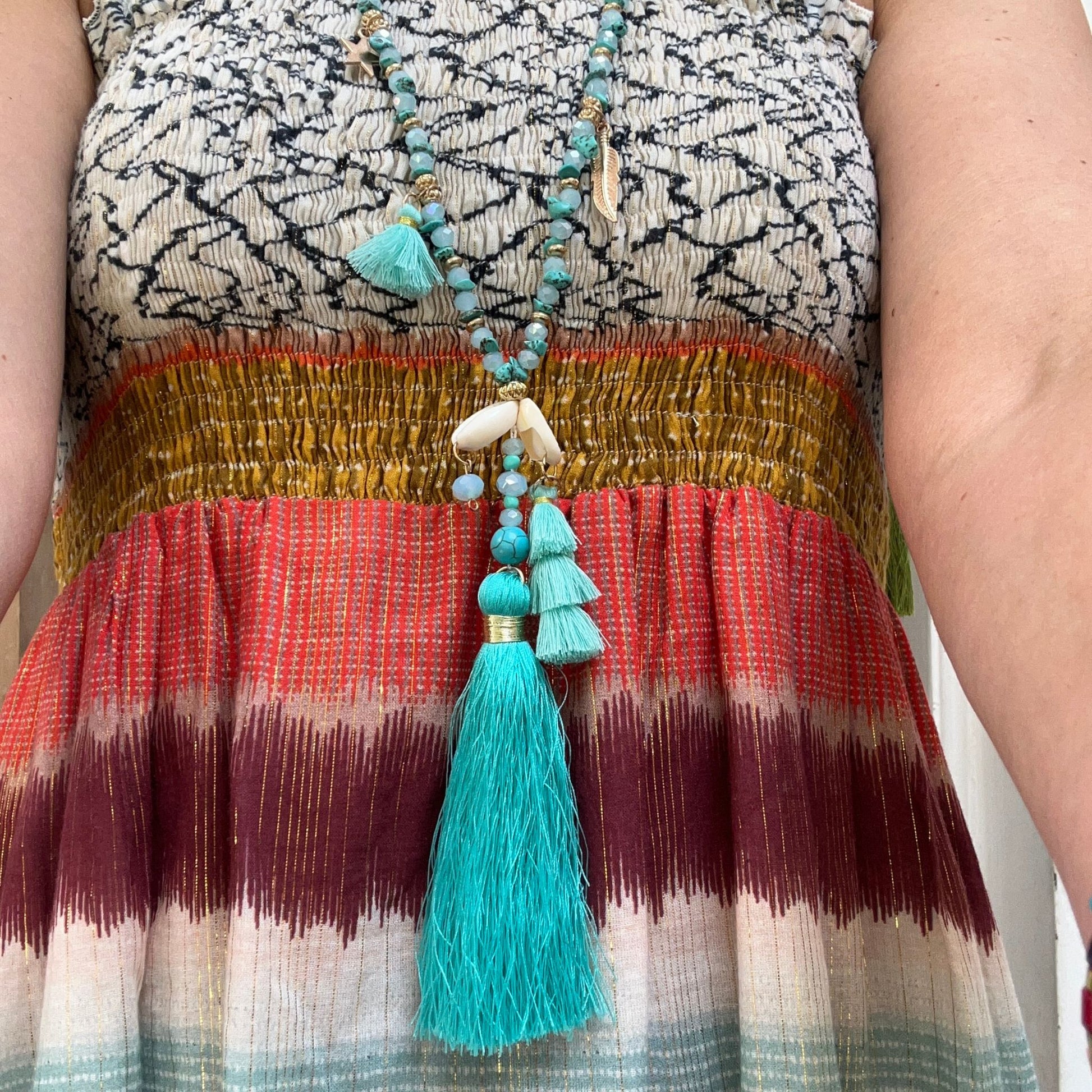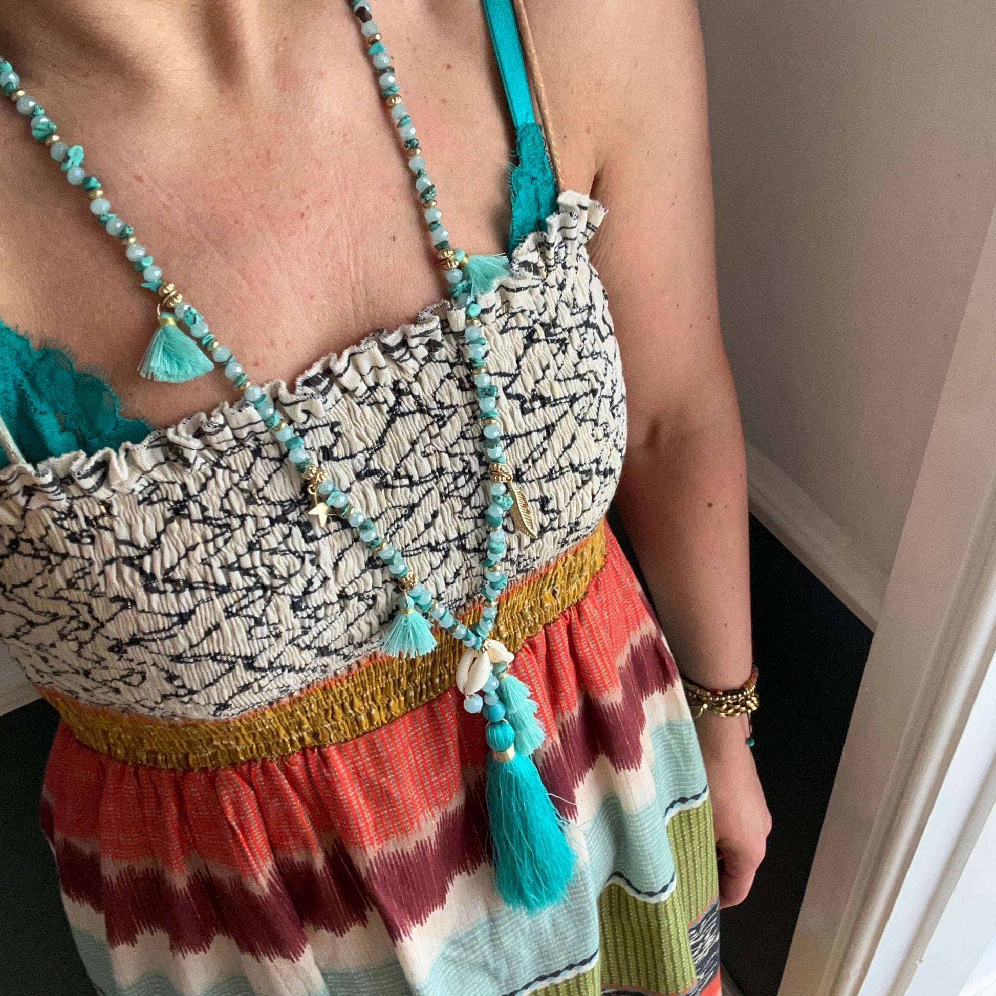 This long boho beaded necklace with semi-precious shells and tassels is just gorgeous. The perfect Summer jewellery, this looks gorgeous with everything from a simple white shirt to a sundress.