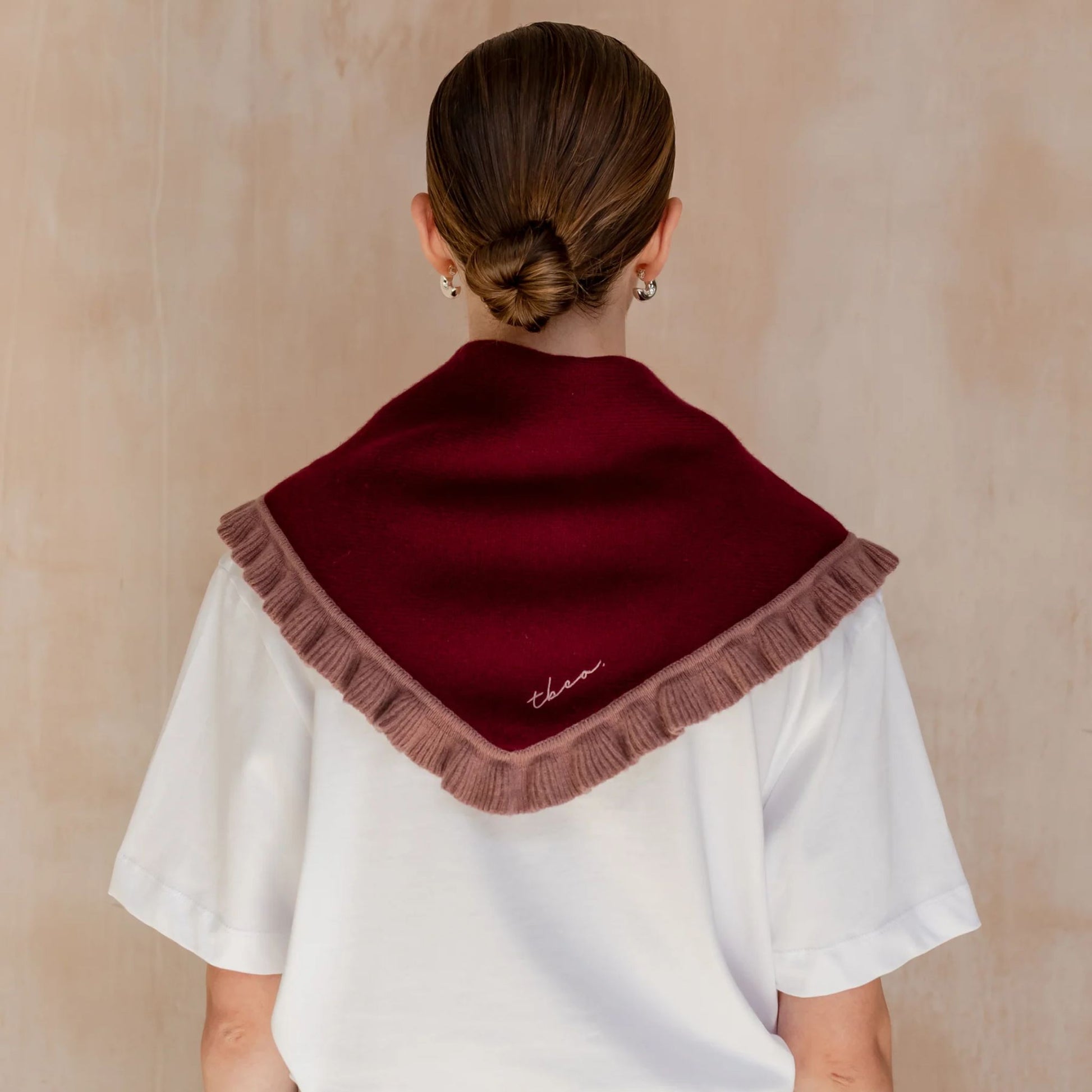 The best-selling Merino Triangle Ruffle Scarf in burgundy and pink. Add instant colour and polish to any outfit with this burgundy triangle scarf, knitted from lightweight and super soft merino wool with a rose pink ruffle trim and embroidered TBCo logo. It can be tied multiple ways for endless styling options and is the perfect finishing touch you'll reach for time and time again. Style with a simple T shirt and jeans or your fave knitwear. Looks great with everything from a trench to a quilted jacket.
