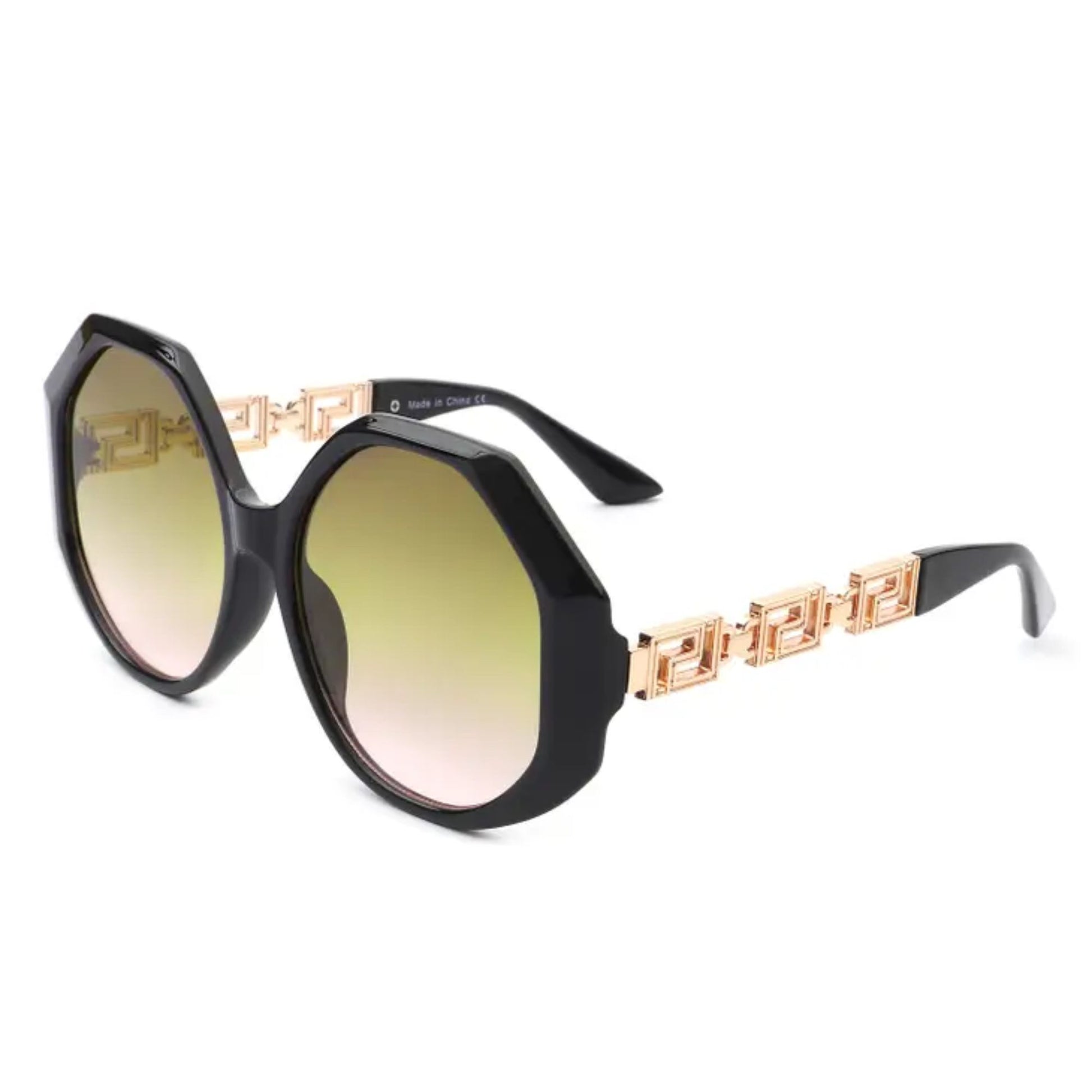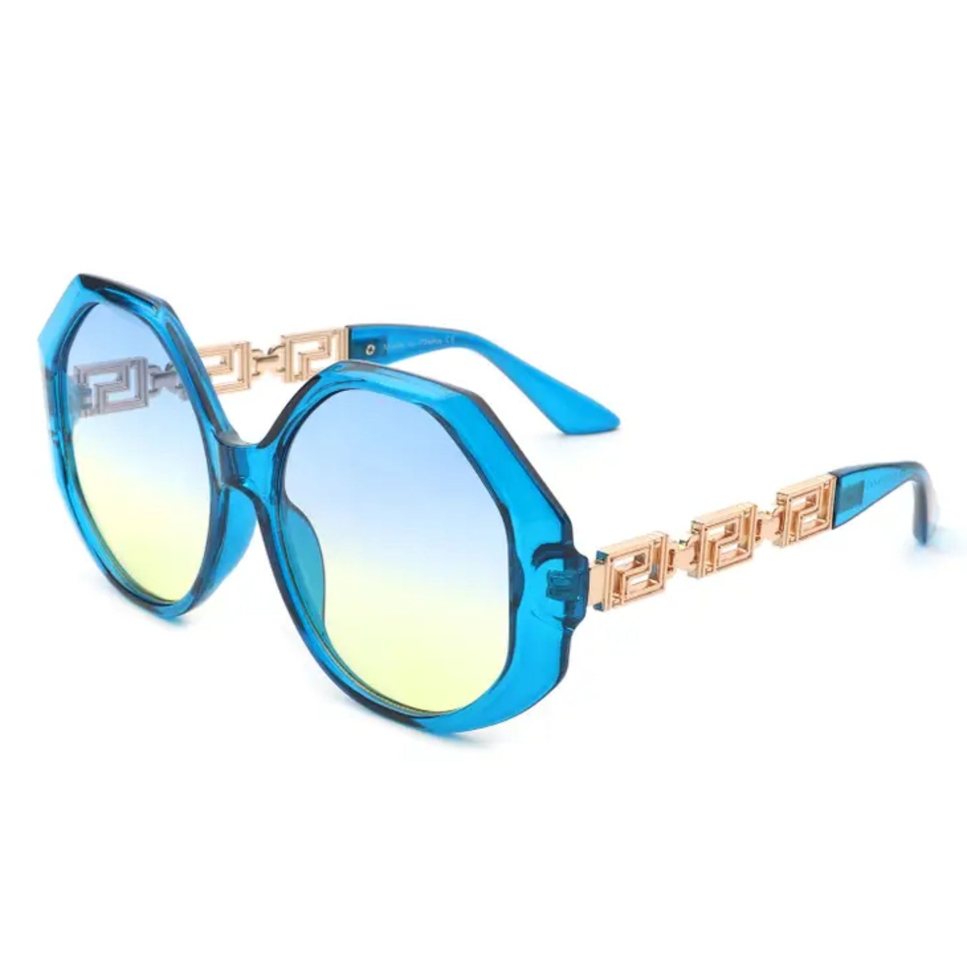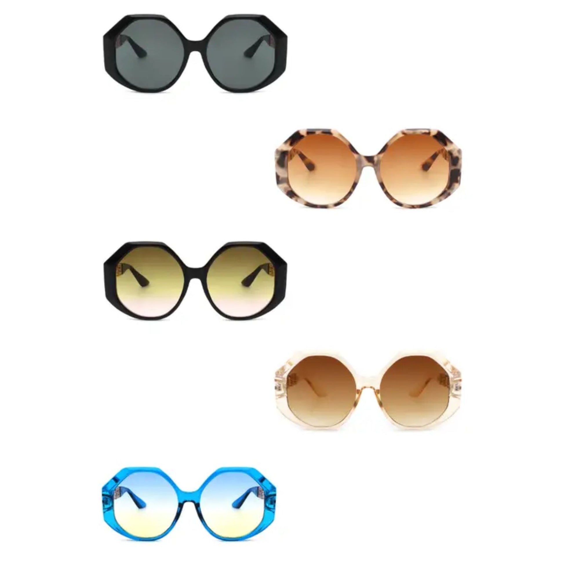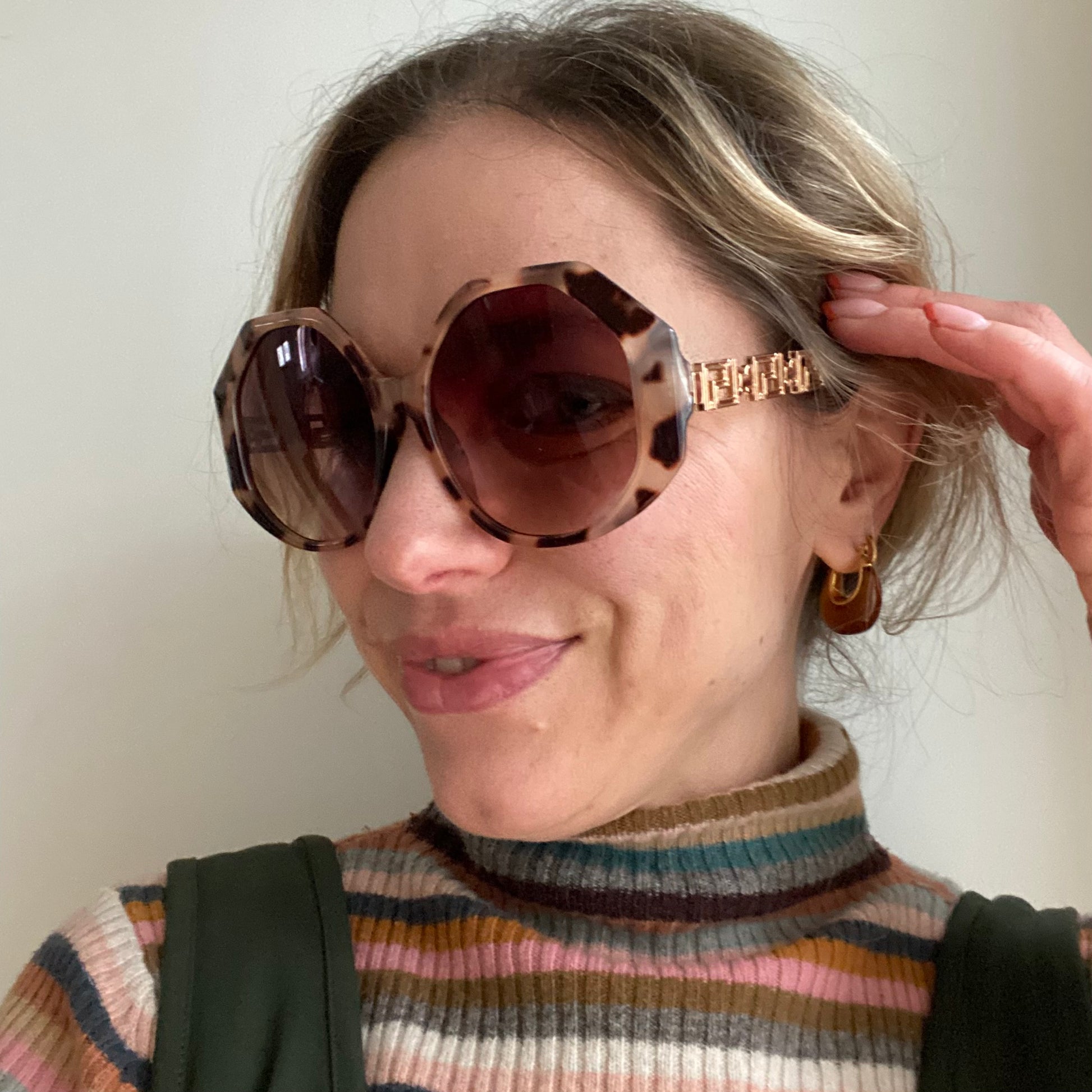 These Oversized Round Geometric Sunglasses are super glam with gorgeous geometric gold detailing on the arms, they look and feel designer and I love them! Available in tortoiseshell, pink, black (black), black (brown) brown clear and blue.