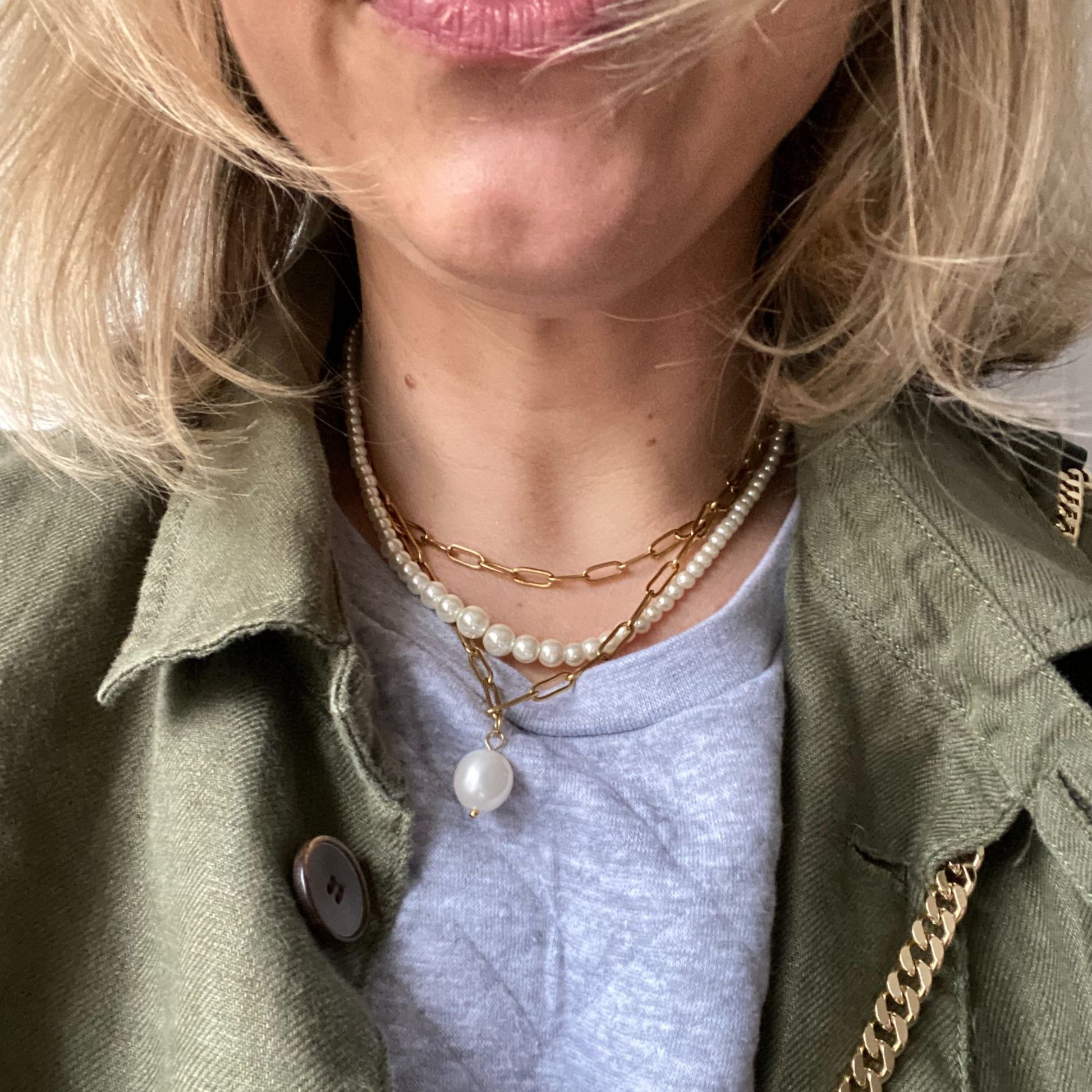 I love that pearls have made a comeback and there are so many ways they can be styled, from the classic string of pearls worn alone to a more modern or edgy take on the classic, layered up with gold necklaces and a more casual outfit, denim, a leather biker or khaki jacket