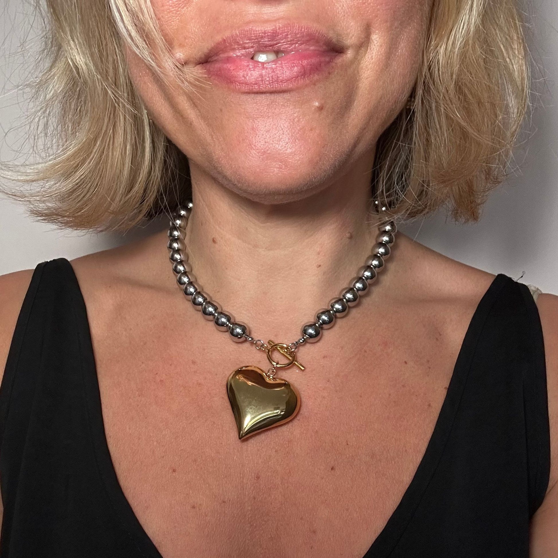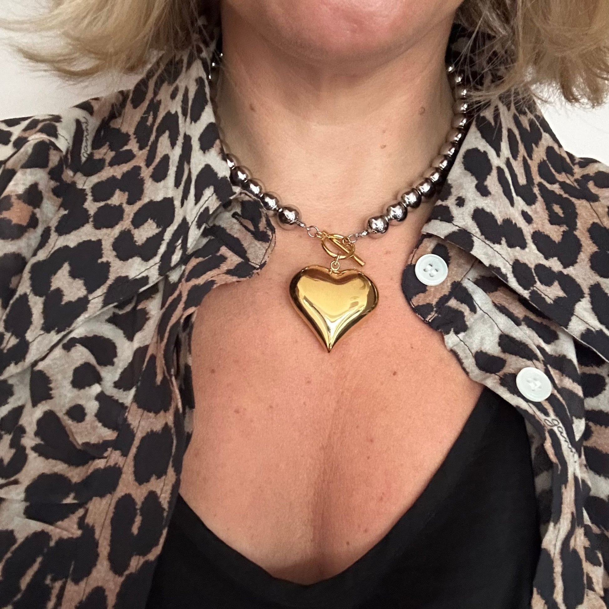 This Silver & Gold Puffy Heart necklace features a silver ball chain with a gold clasp and oversized puffy gold heart. It really elevates a simple look and I love it with a classic white shirt or t shirt.