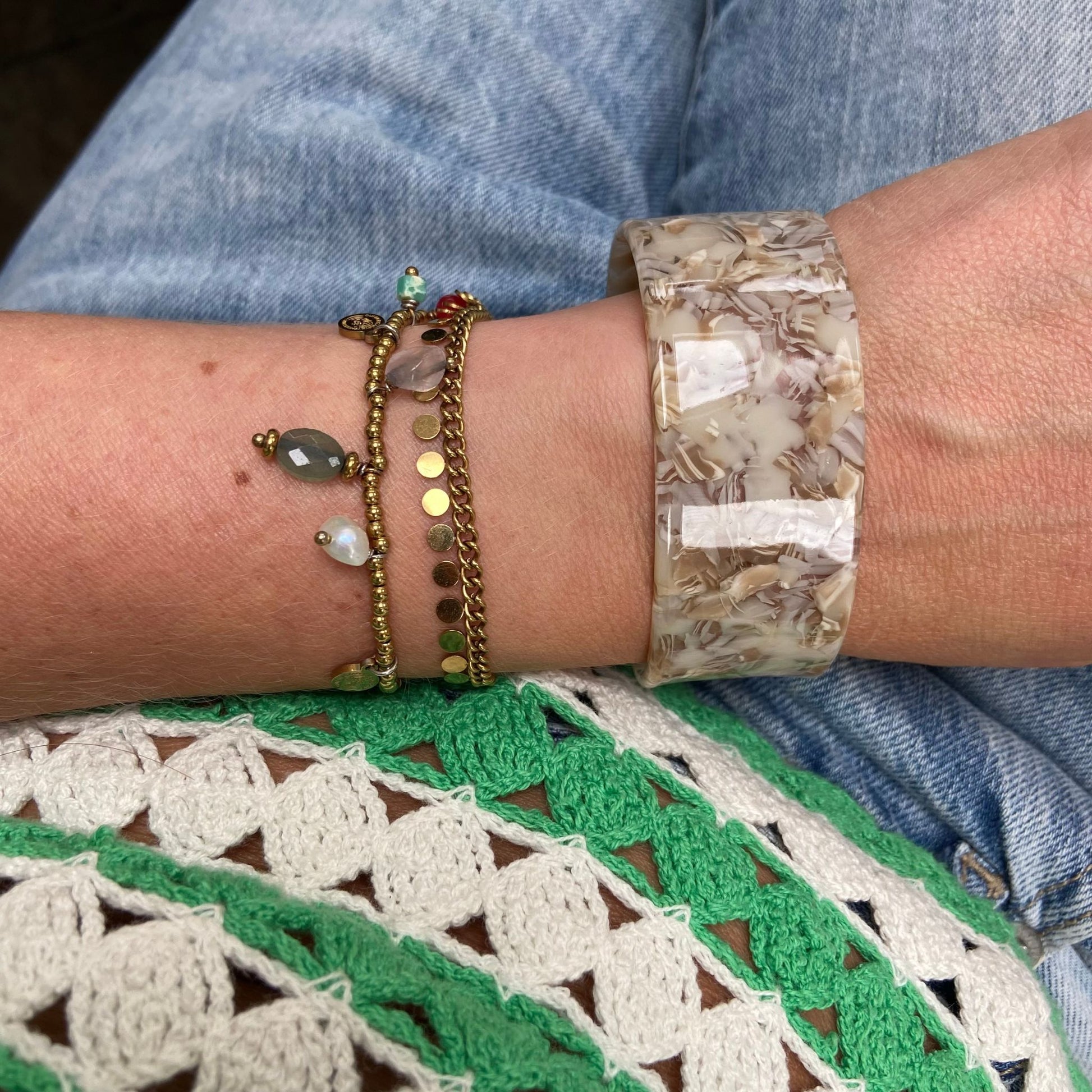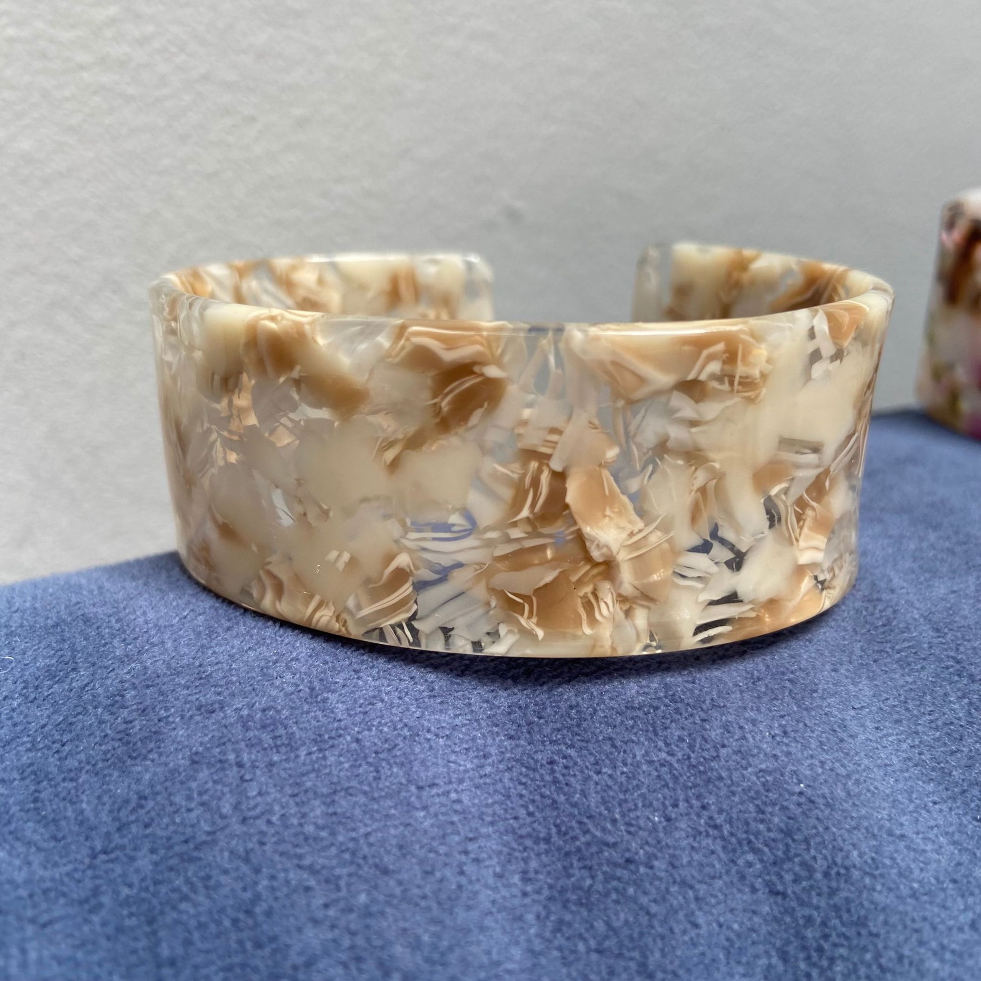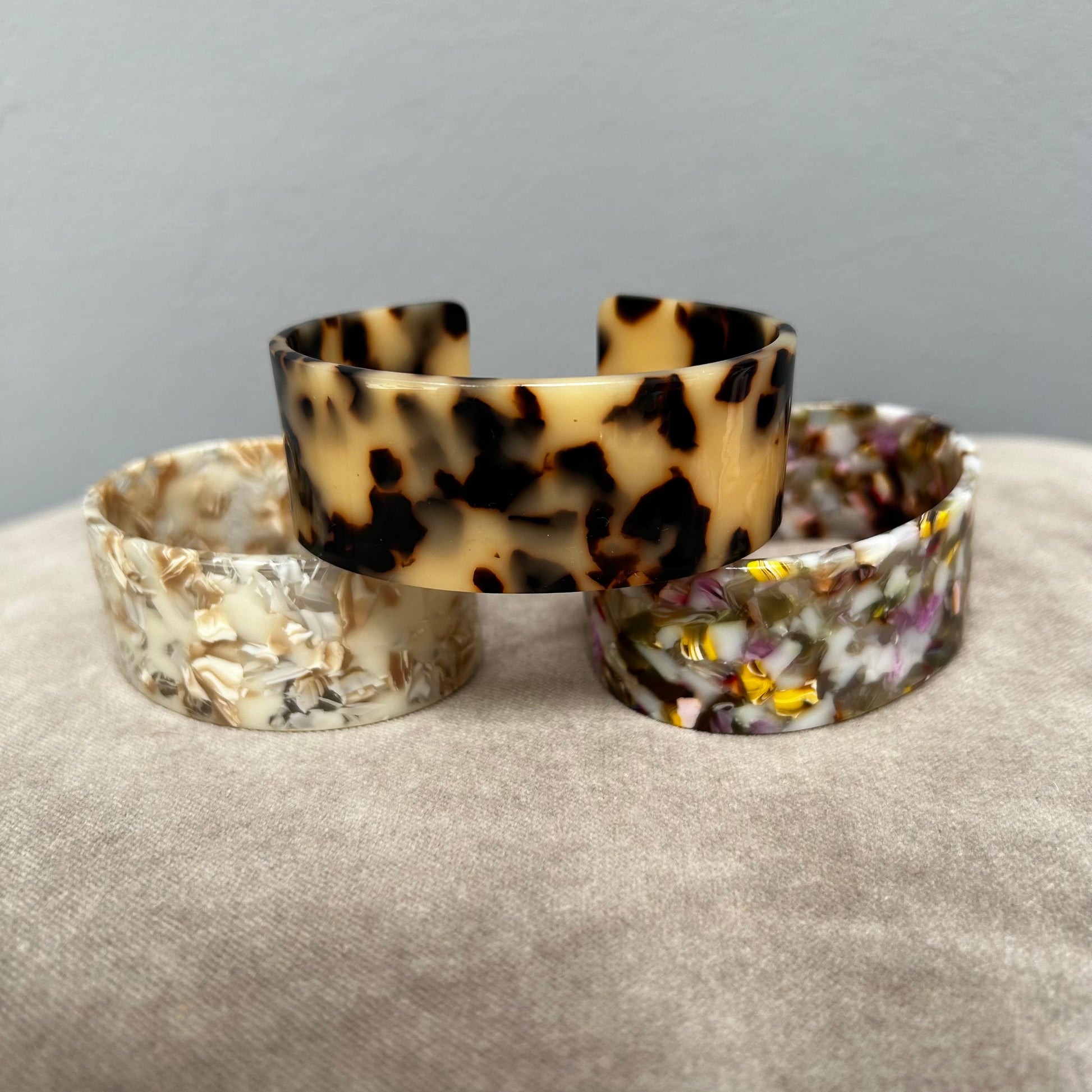 These Statement Cuffs or bangles are a great way to update your outfit. In three designs, tortoise shell, multi coloured and beige. Wear alone or stack up with gold or silver jewellery.