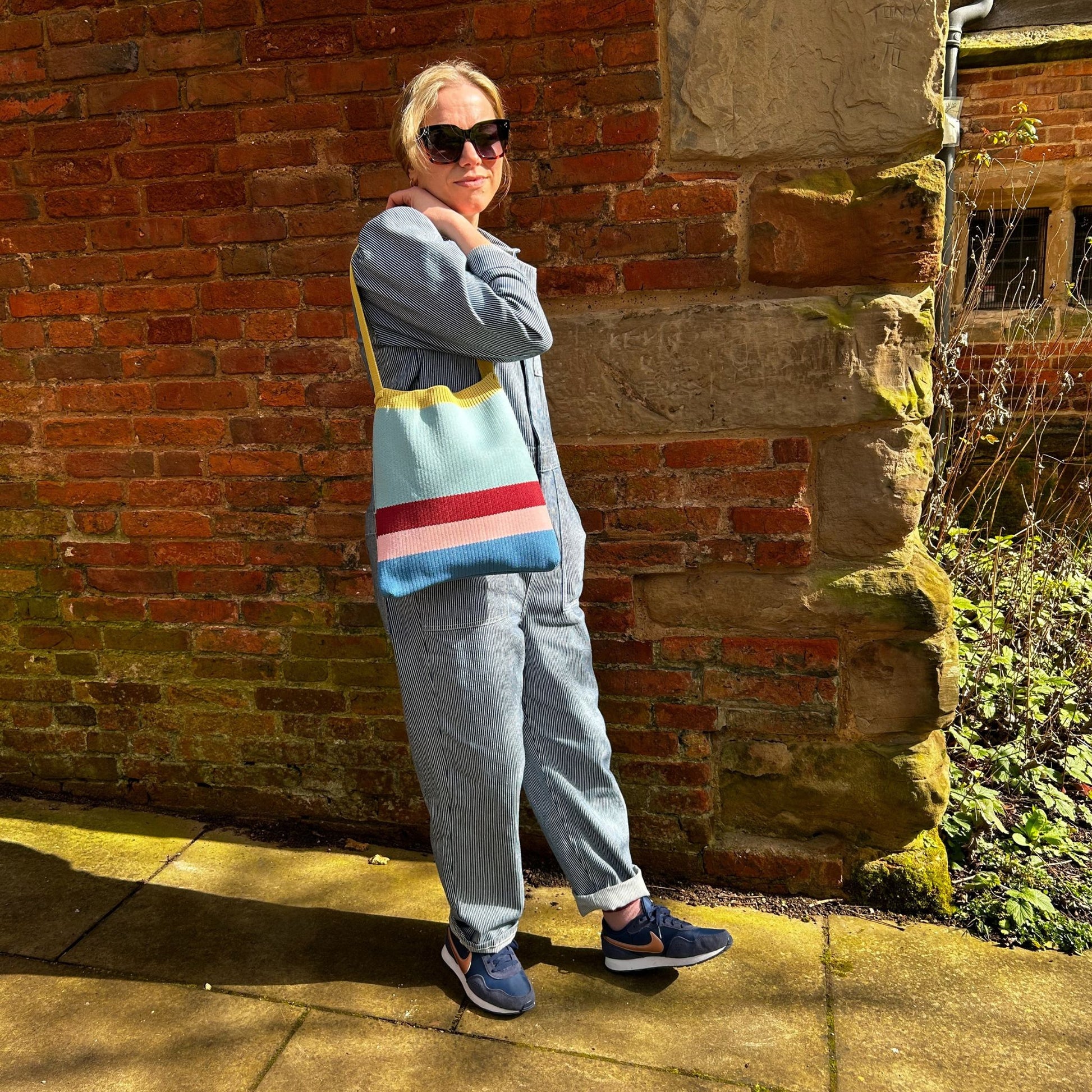 The Retro Striped Knitted Bag is a fab little bag for Spring / Summer. These retro style little bags are perfect for occasions when you need a bit more than your handbag or bumbag will hold. I used mine for a park trip to carry water and an umbrella. Also great for popping to the shops if you only need a few bits, as a lunch bag for work, a beach bag.