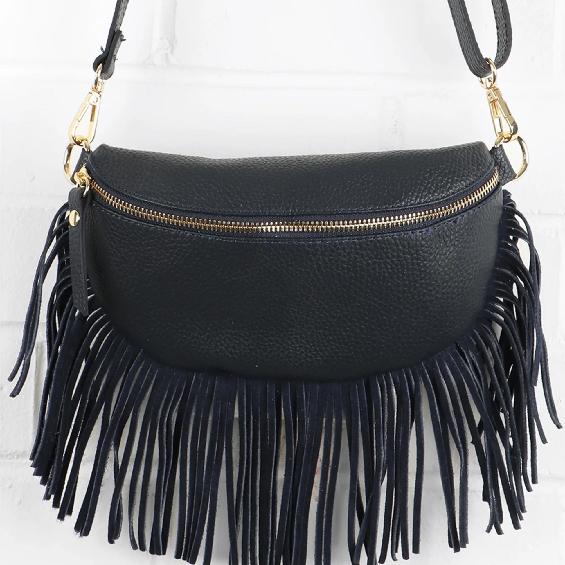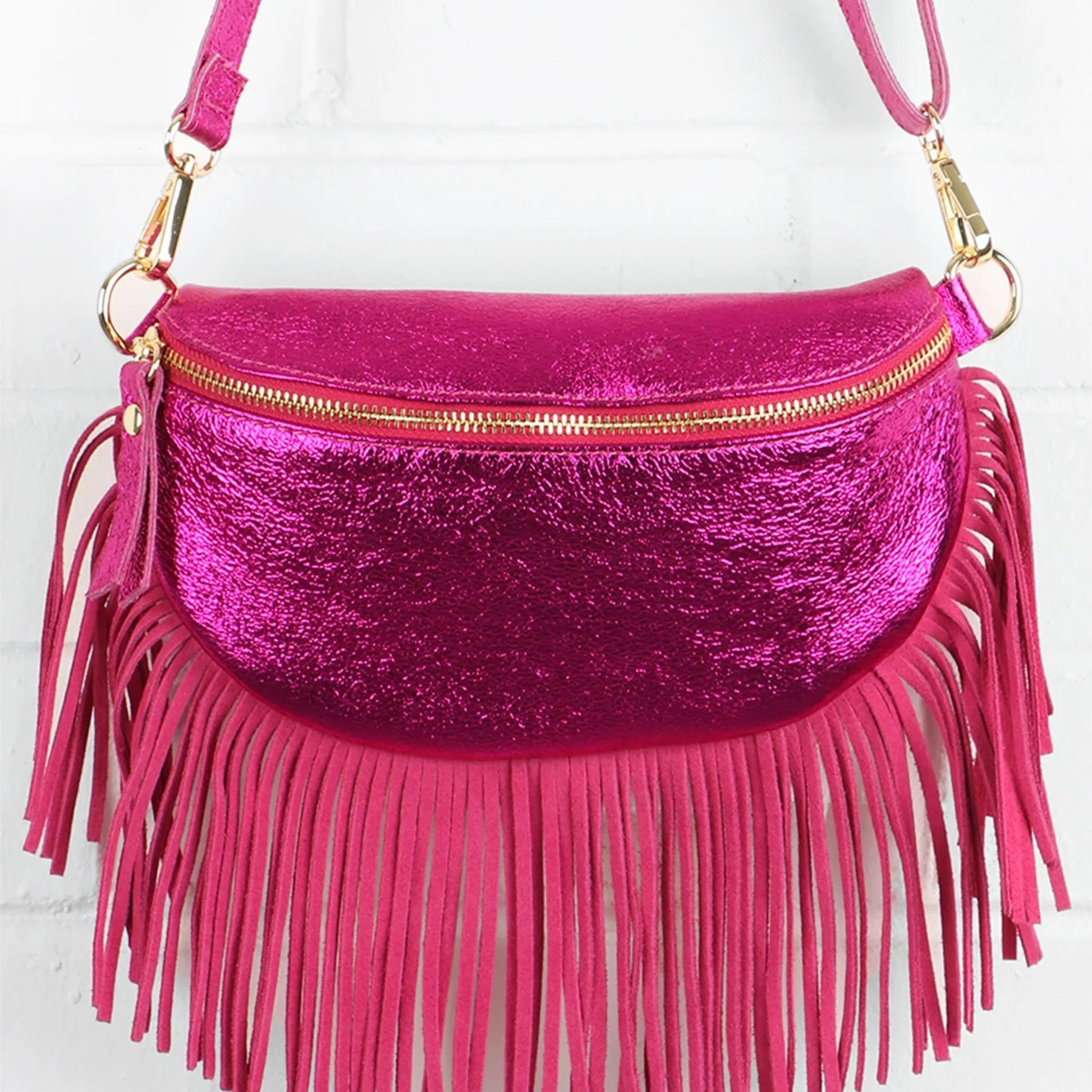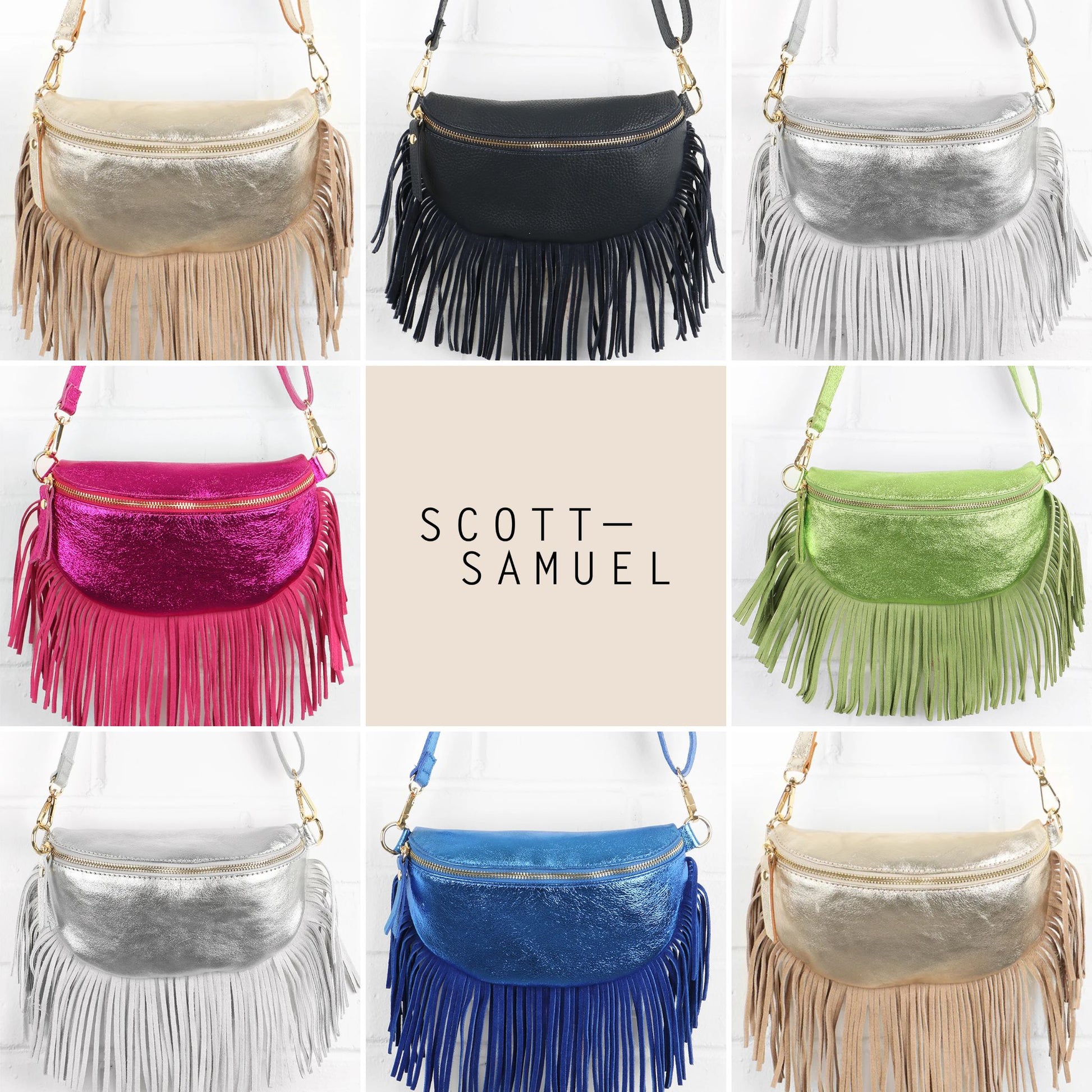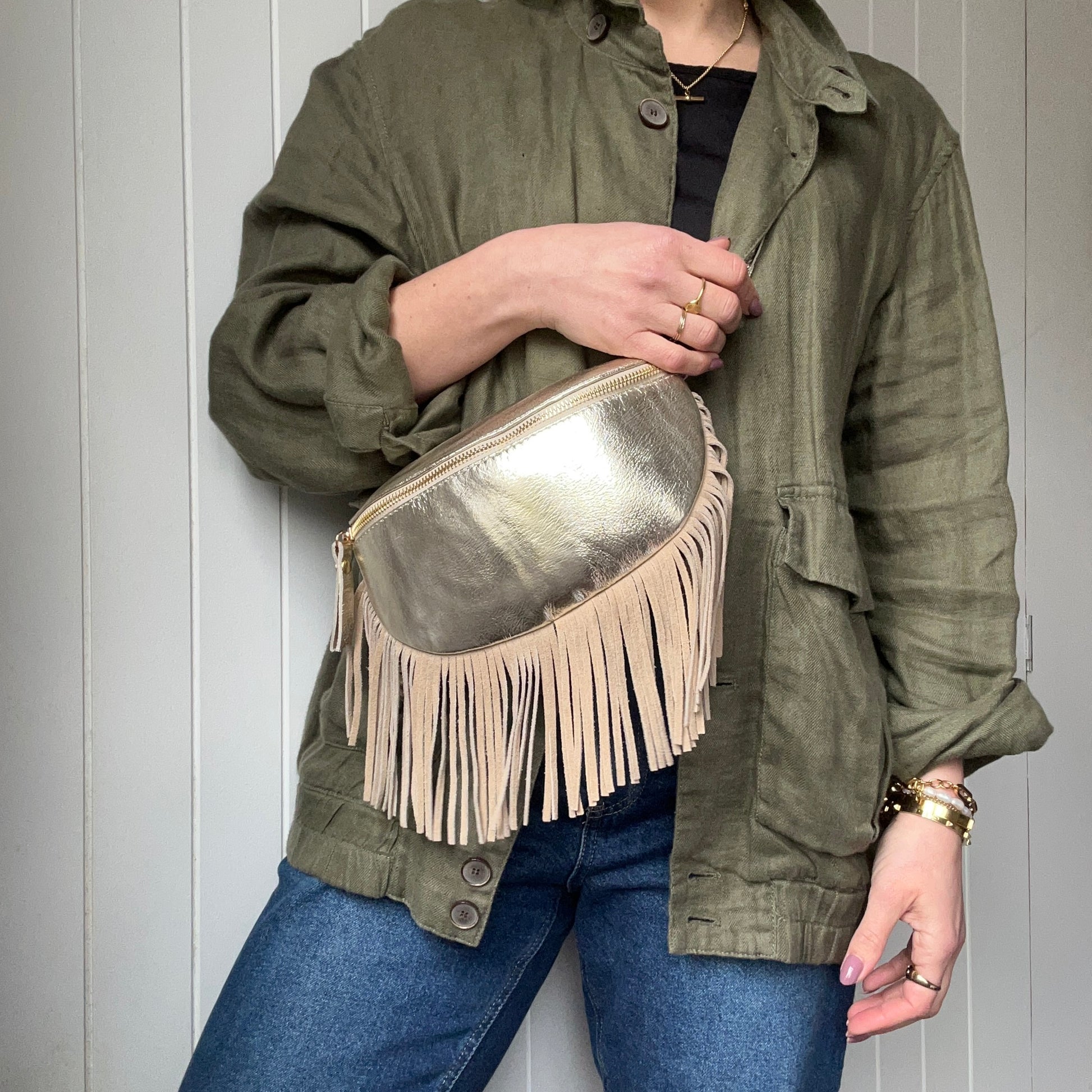 Meet your new Summer bag, the fringed leather 'bumbag' is the perfect cross-body holiday , festival bag or going out bag! Our leather crossbody Bumbags can be dressed up or down. The leather bumbag is your perfect holiday bag, school run bag dog walk bag, shopping bag, travel bag … everything bag! As with all of our bags, these bumbags are beautiful quality, 100% Italian leather and is lined, features an internal zipped pocket and gold hardware. Protective dustbag with every bumbag.