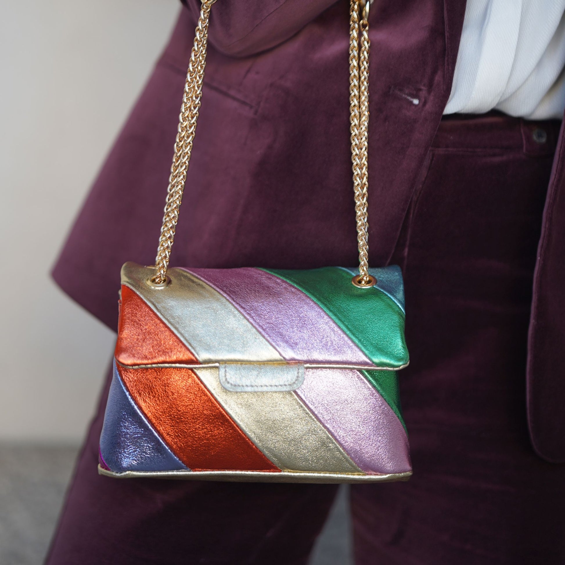 This Metallic Stripe Leather Bag is a fabulous statement bag for a party or night out! The quality is absolutely beautiful. 100% Italian leather. It has a magnetic snap fastening, an inner pocket. It has a chain and leather strap that can be worn cross-body or as an handbag, or can be tucked away and used as a clutch.