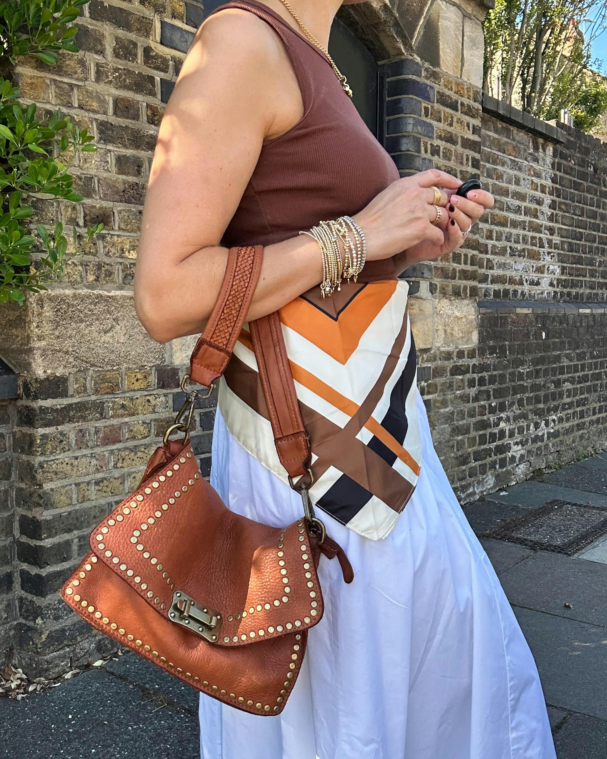 This Studded Vintage style bag is an absolute beauty. This medium-sized shoulder bag comes in the most butter-soft washed leather, in cognac or chocolate . It is beautiful quality, handmade, 100% Italian leather.