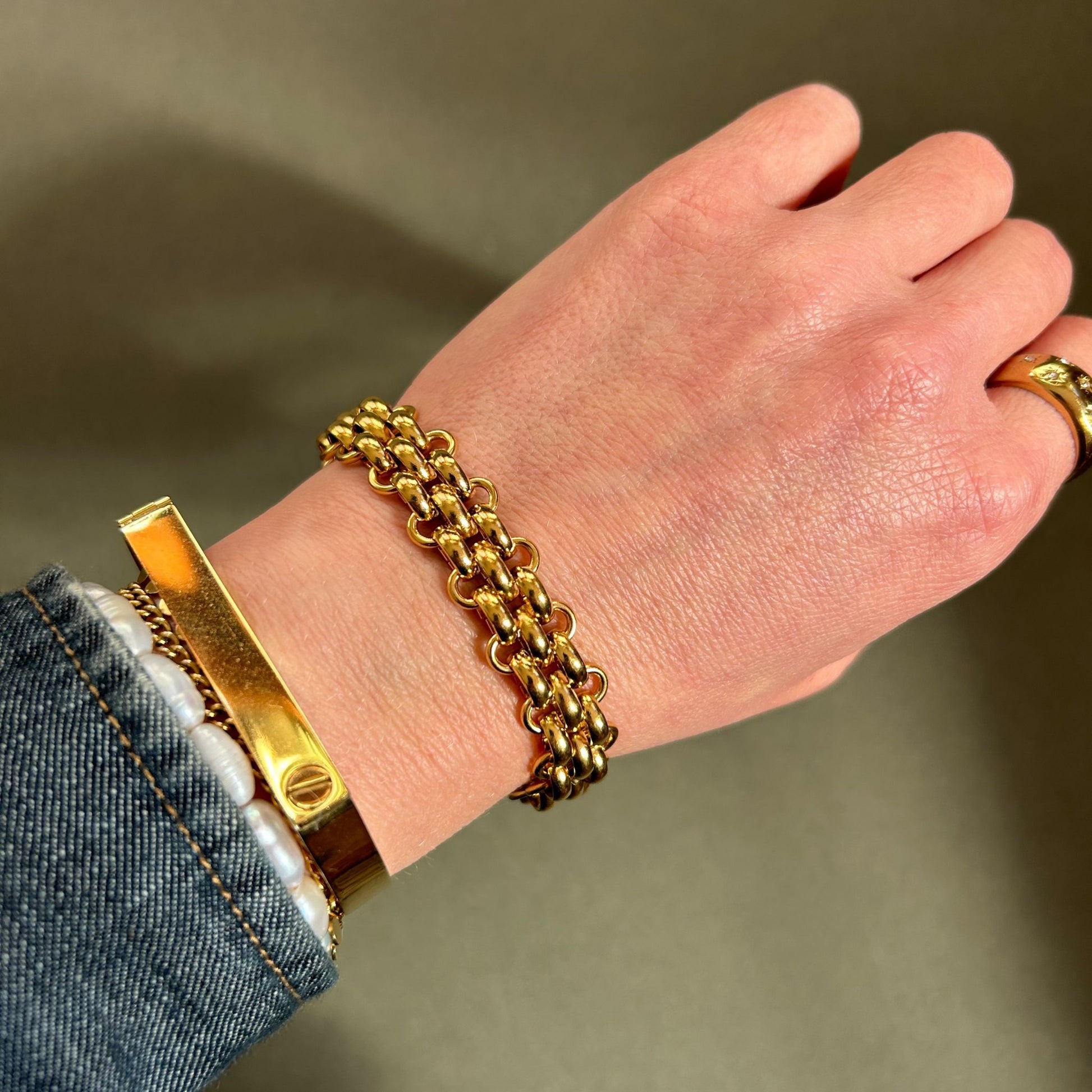 This Triple Layer Chunky Gold Bracelet is just gorgeous, a real statement luxe looking piece. This bracelet features a T bar fastening, it is 18-carat Gold Plating on Stainless Steel, which makes it waterproof and means you need never take it off. Wear alone or add to your stack.