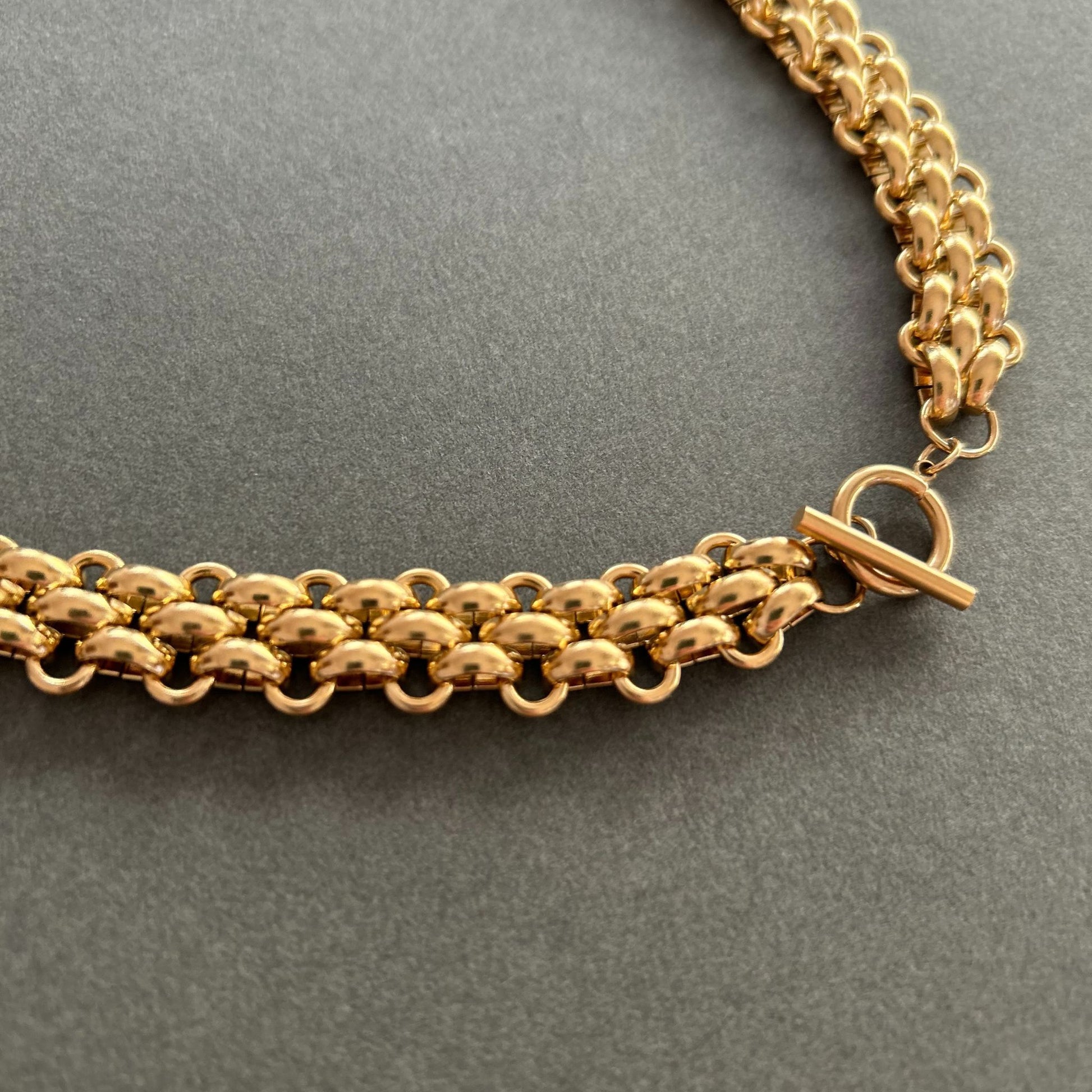 This Triple Layer Chunky Gold Necklace is just gorgeous, a real statement luxe looking piece. This necklace features a T bar fastening, it is 18-carat Gold Plating on Stainless Steel, which makes it waterproof and means you need never take it off. Wear alone or layer up.