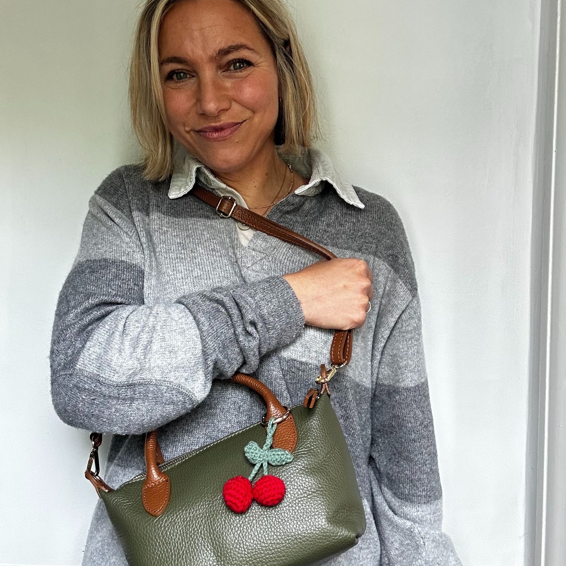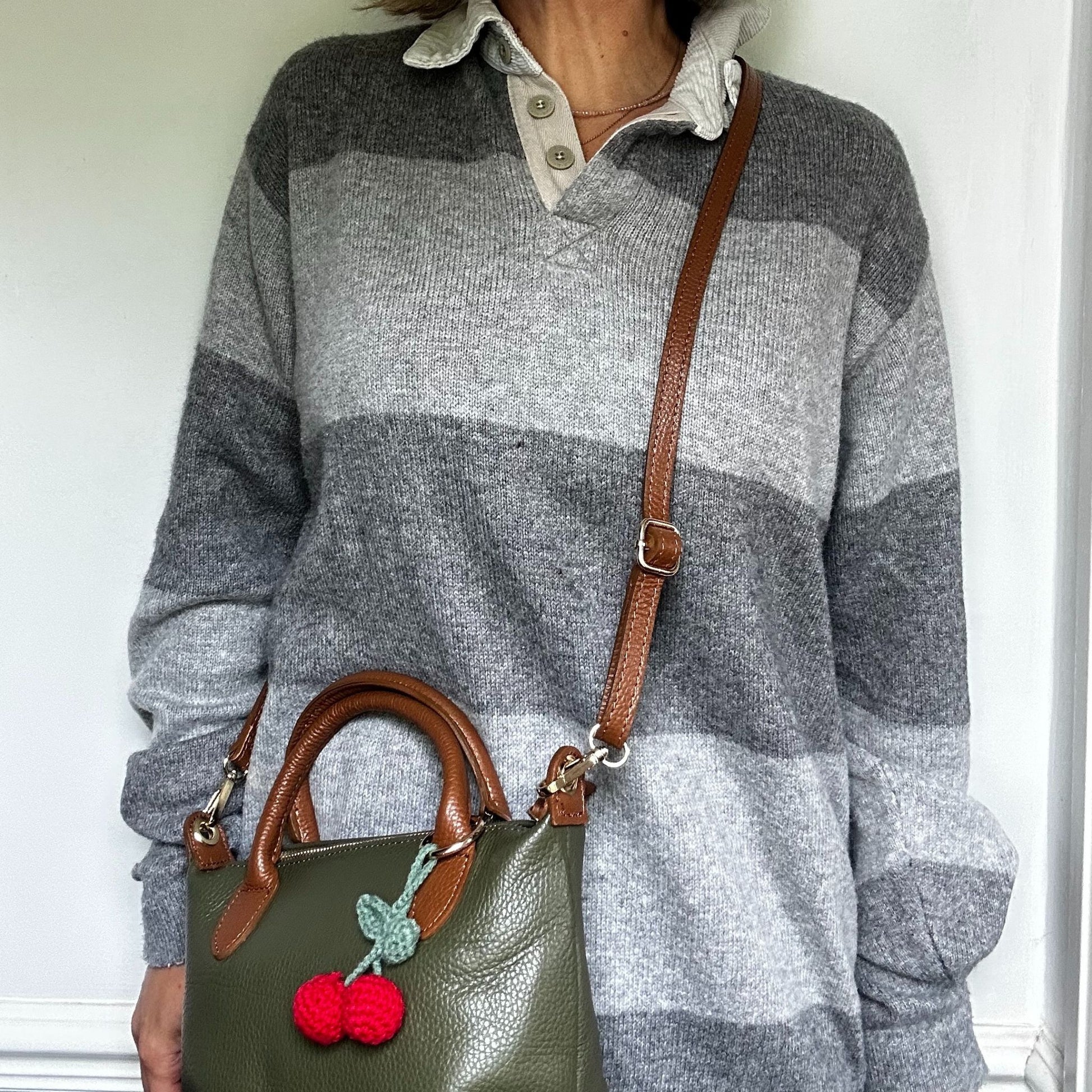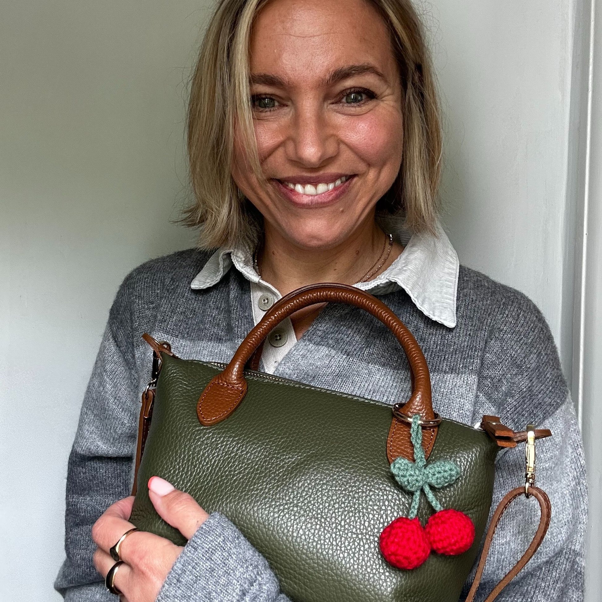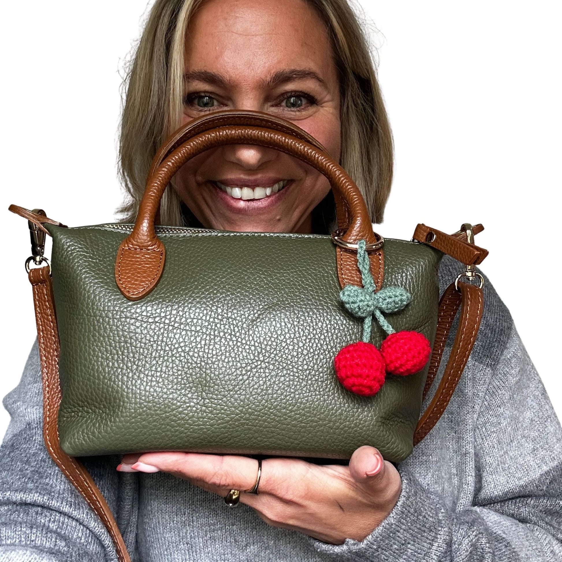 I loved this little cutie the moment I set eyes on it! Two tone leather in khaki with a contrasting cognac handle and strap. This bag can be carried with the grab handle or worn as a cross body with the extendable strap. I have added a crochet cherry charm to mine just because...
