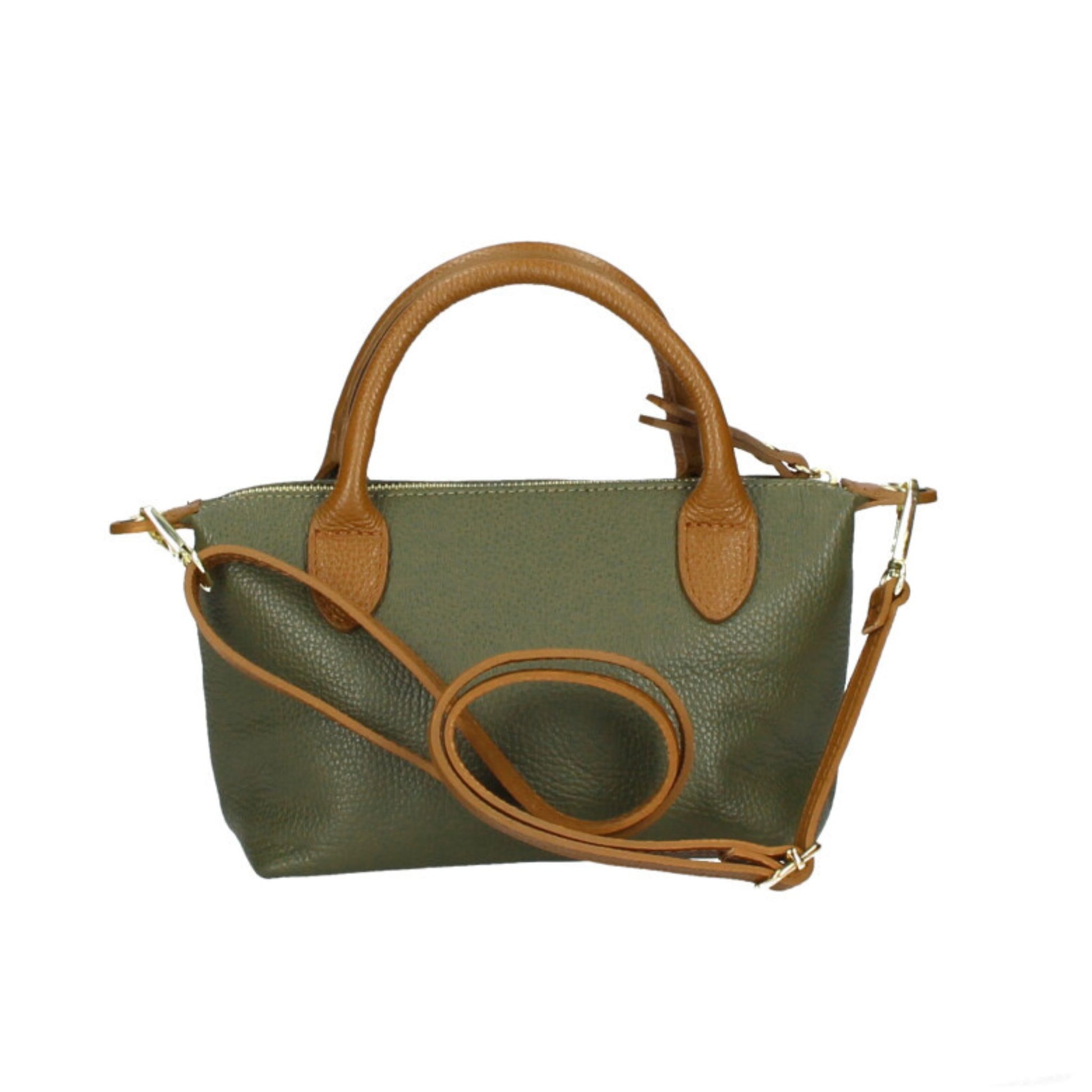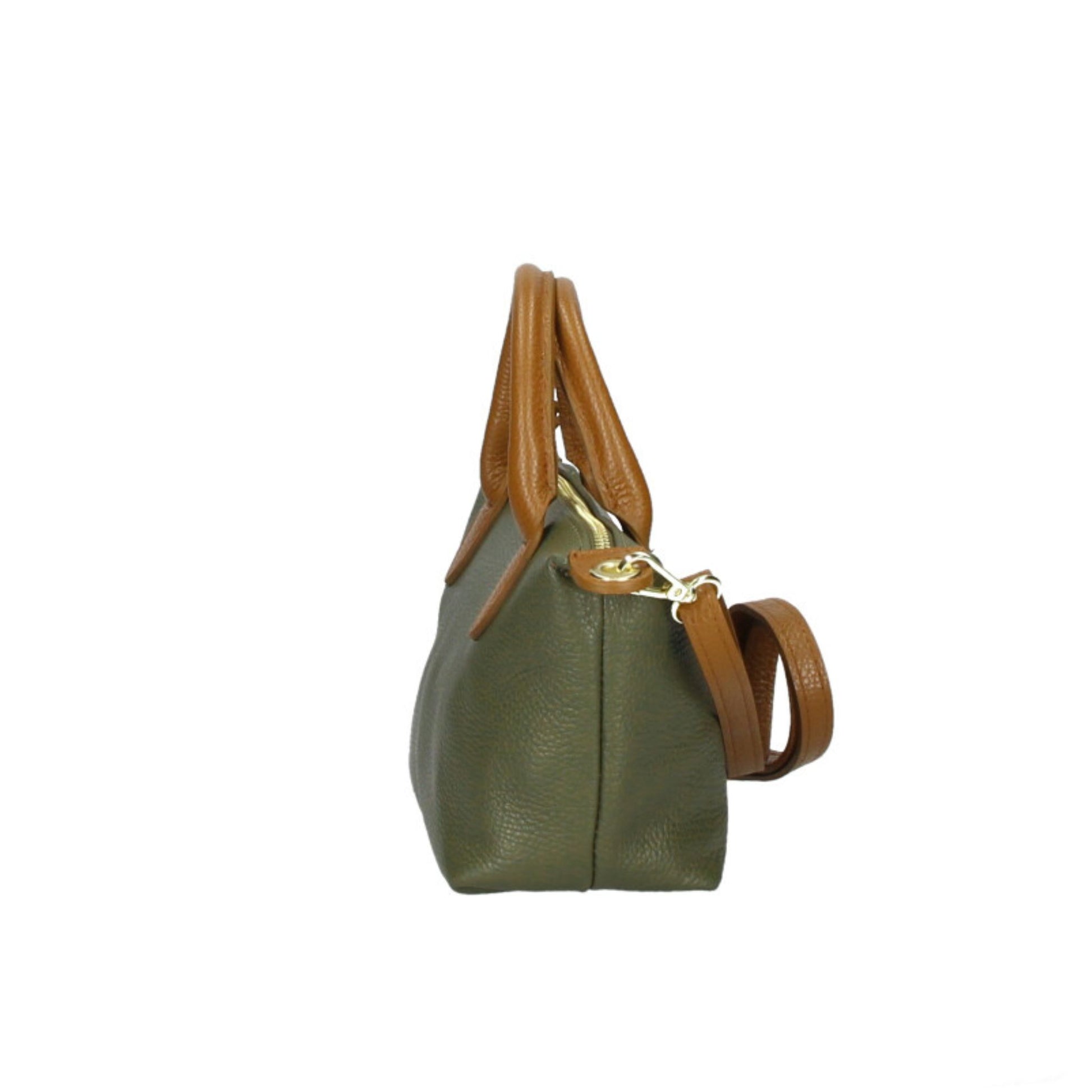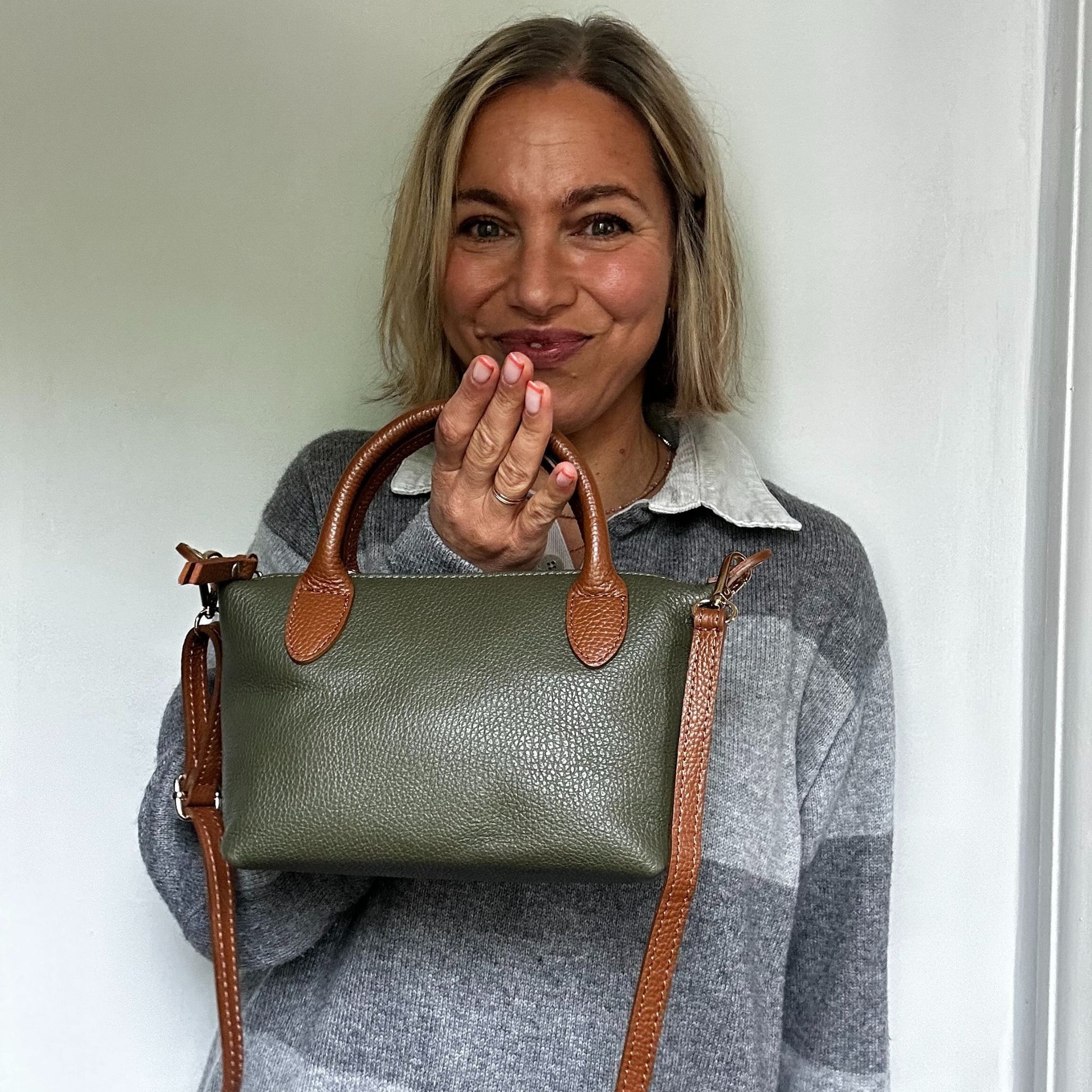 I loved this little cutie the moment I set eyes on it! Two tone leather in khaki with a contrasting cognac handle and strap. This bag can be carried with the grab handle or worn as a cross body with the extendable strap. I have added a crochet cherry charm to mine just because...