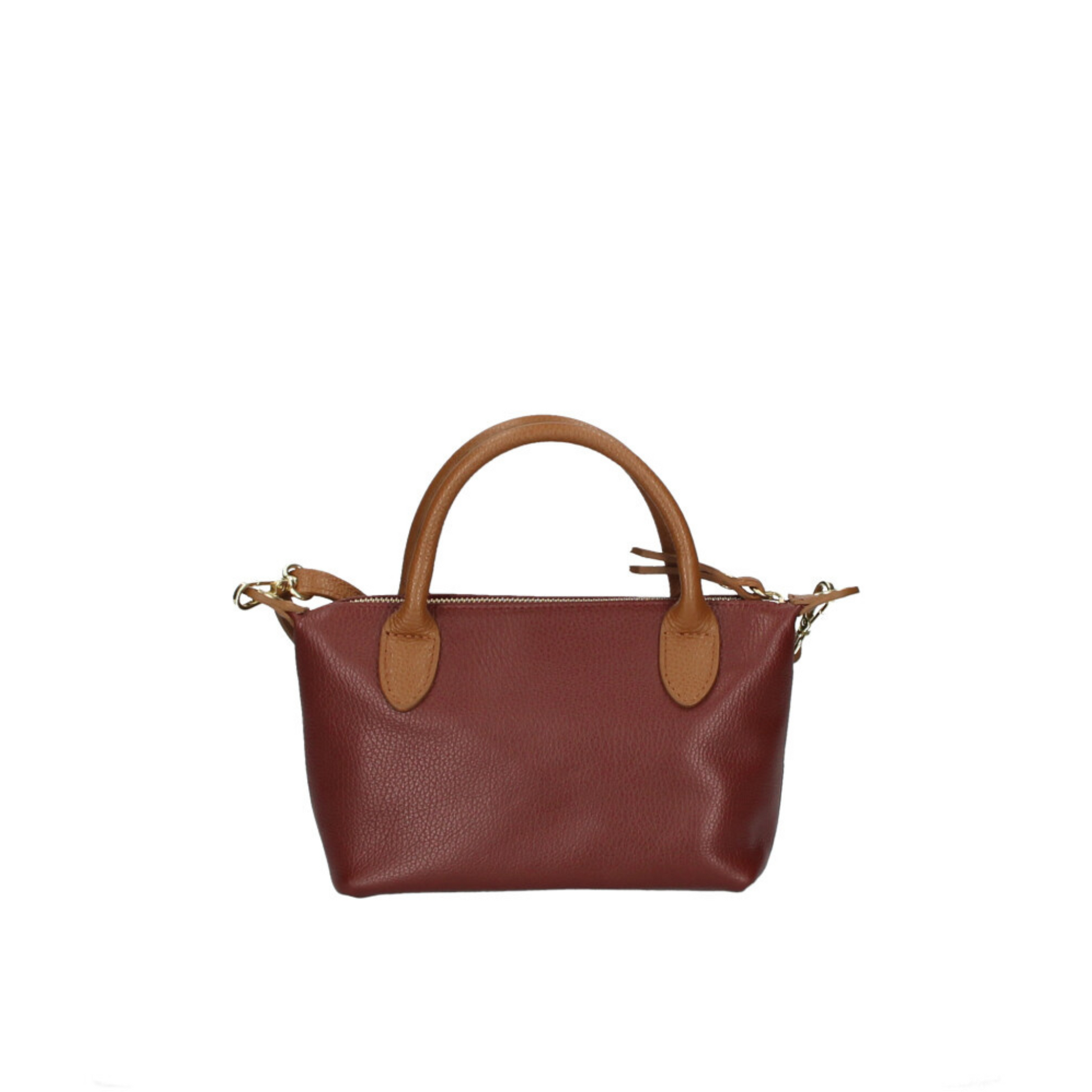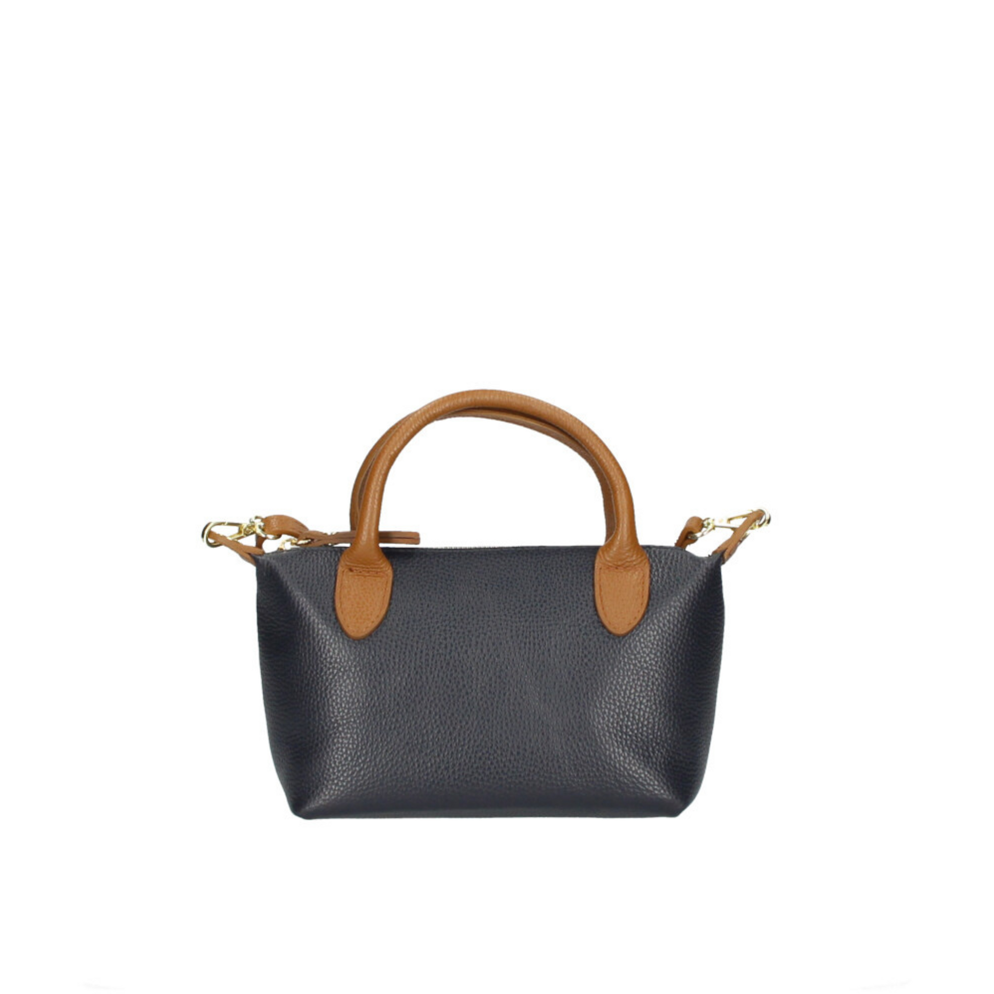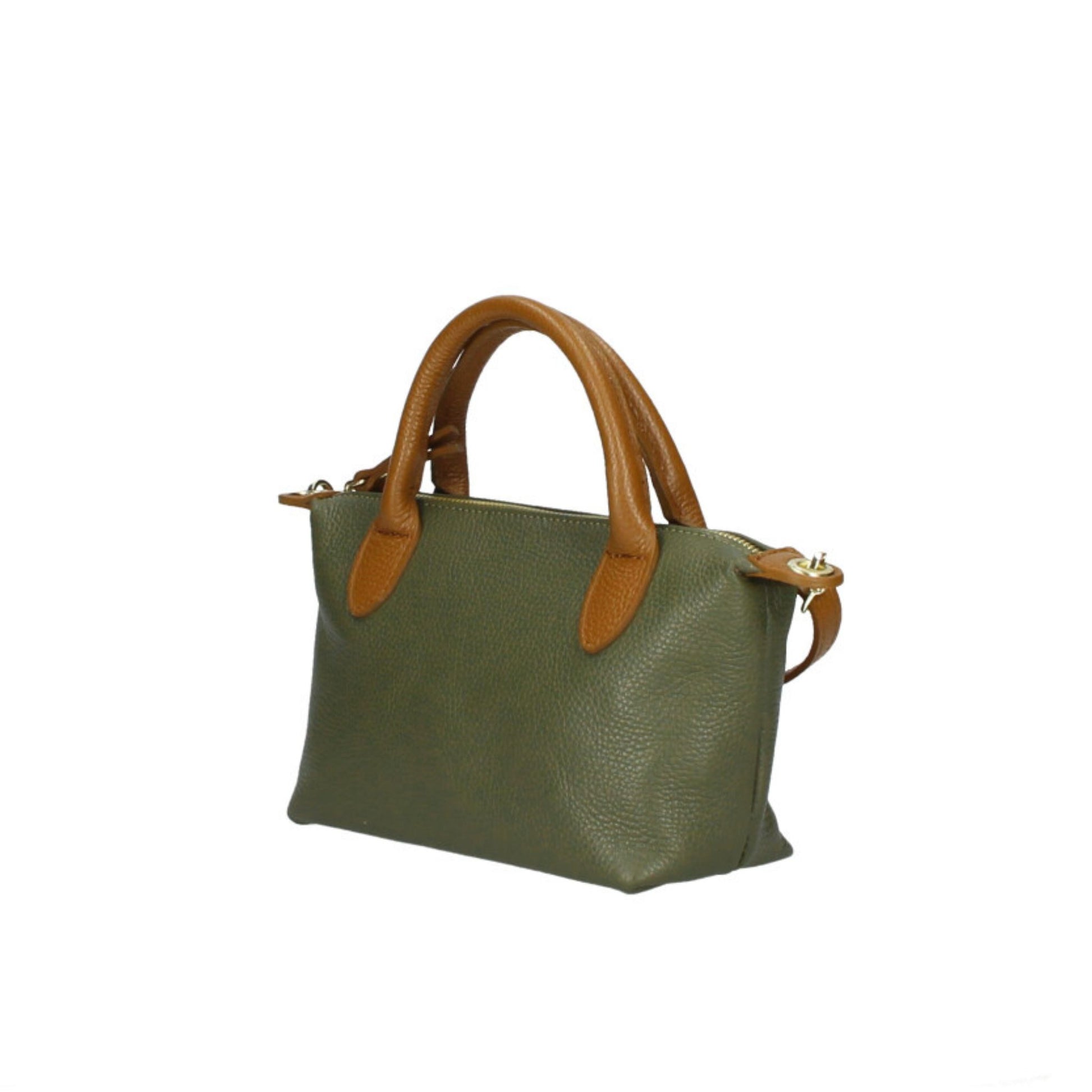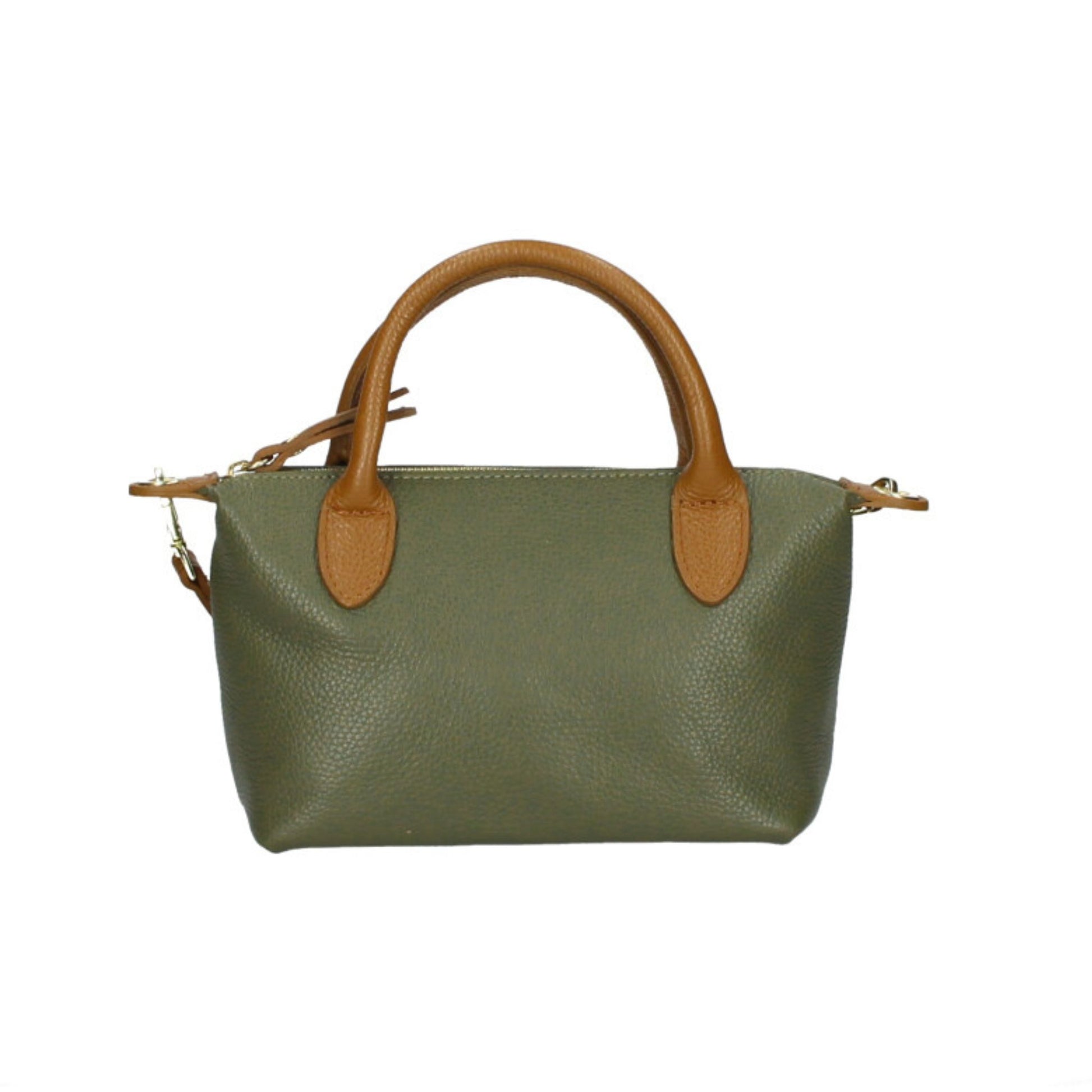 I loved this little cutie the moment I set eyes on it! Two tone leather in khaki with a contrasting cognac handle and strap. This bag can be carried with the grab handle or worn as a cross body with the extendable strap. I have added a crochet cherry charm to mine just because...